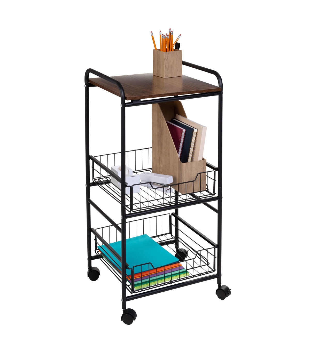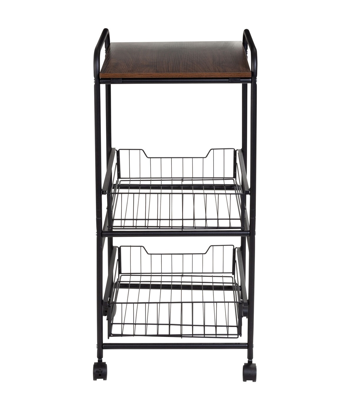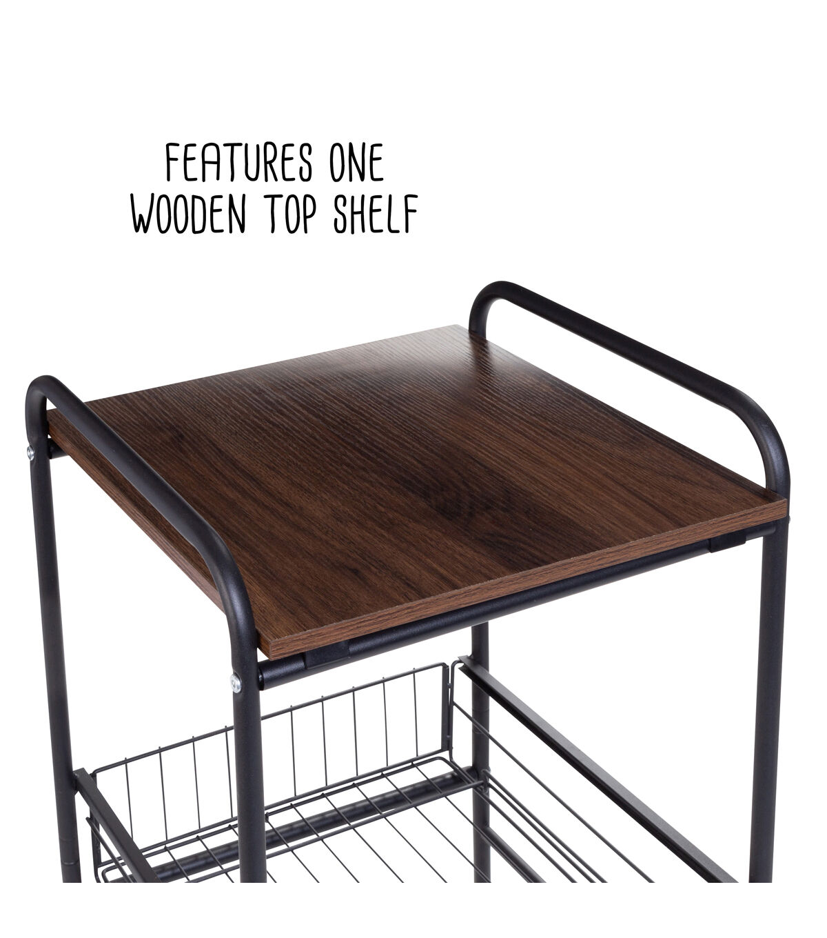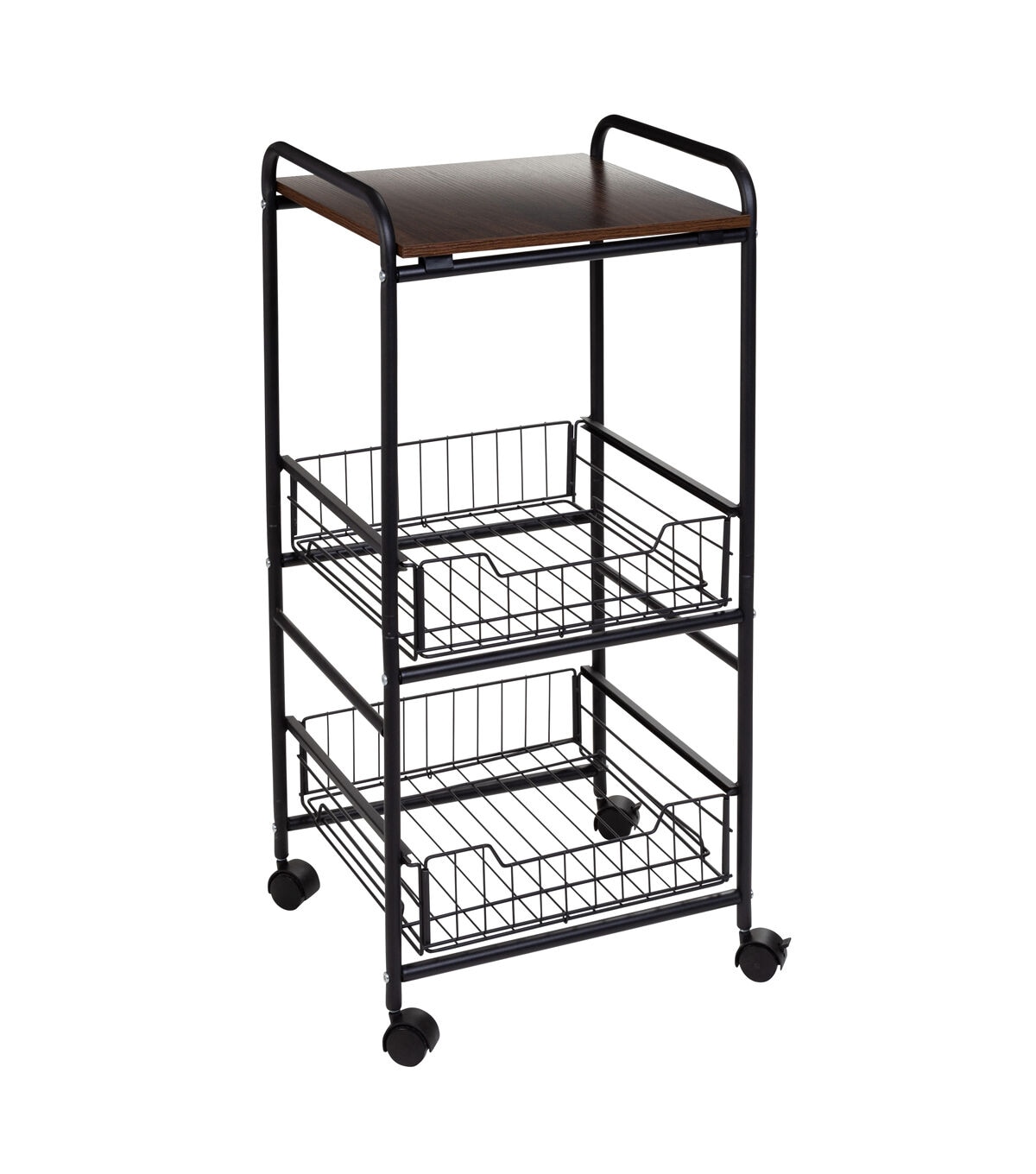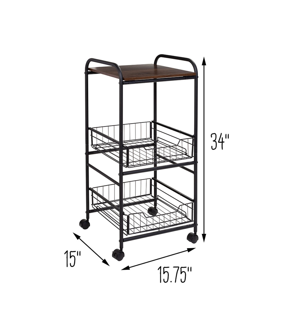 - Slim storage cart with wheels featuring 3 tiers: 1 wood top shelf, 2 slide-out metal baskets