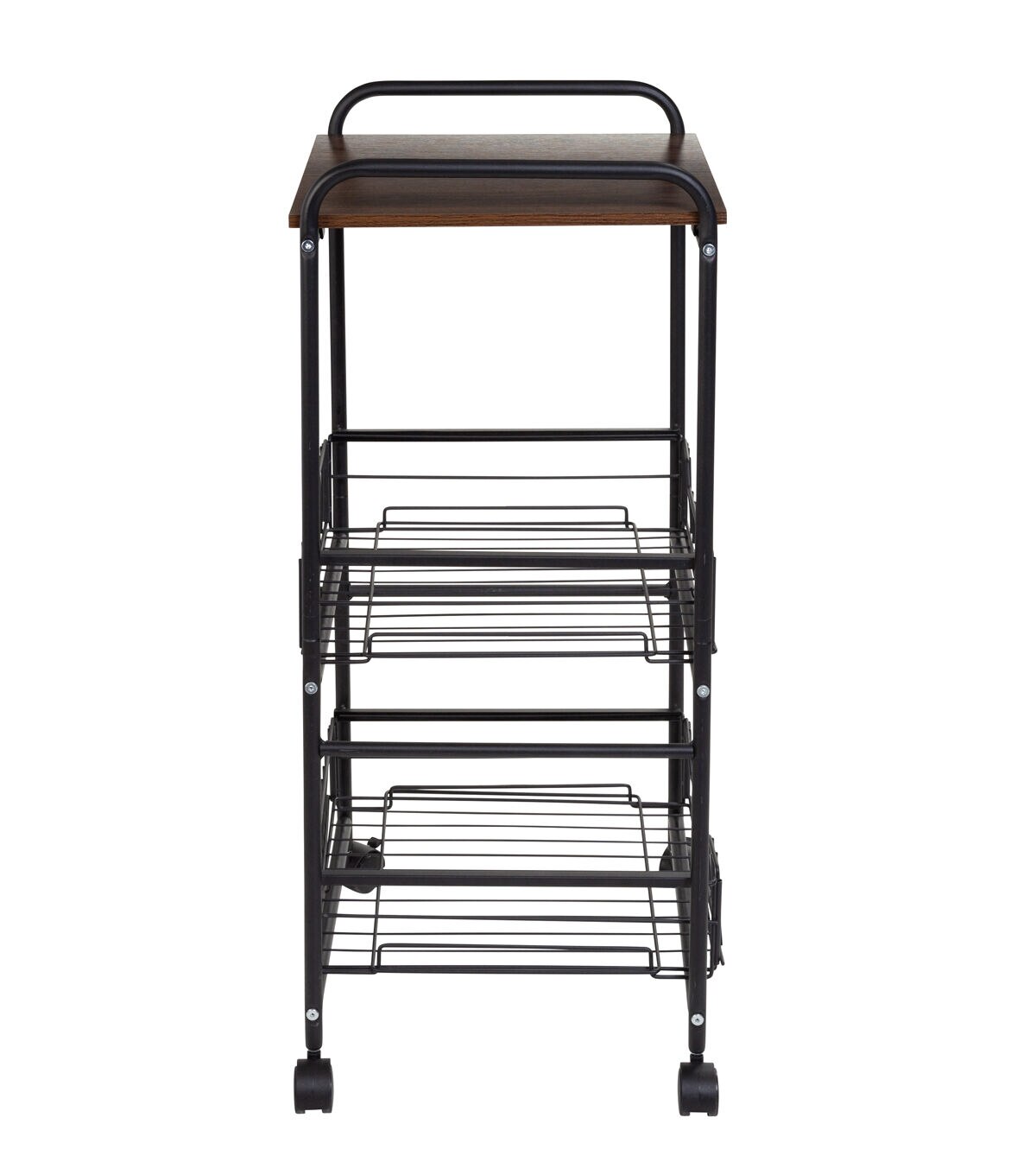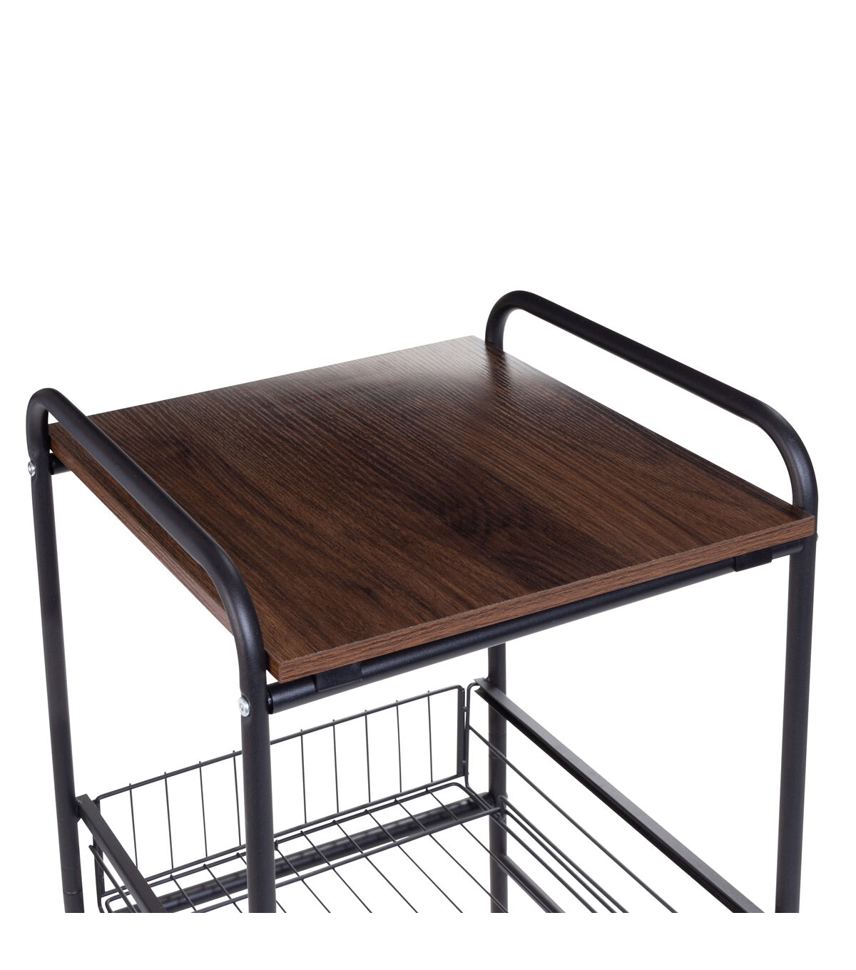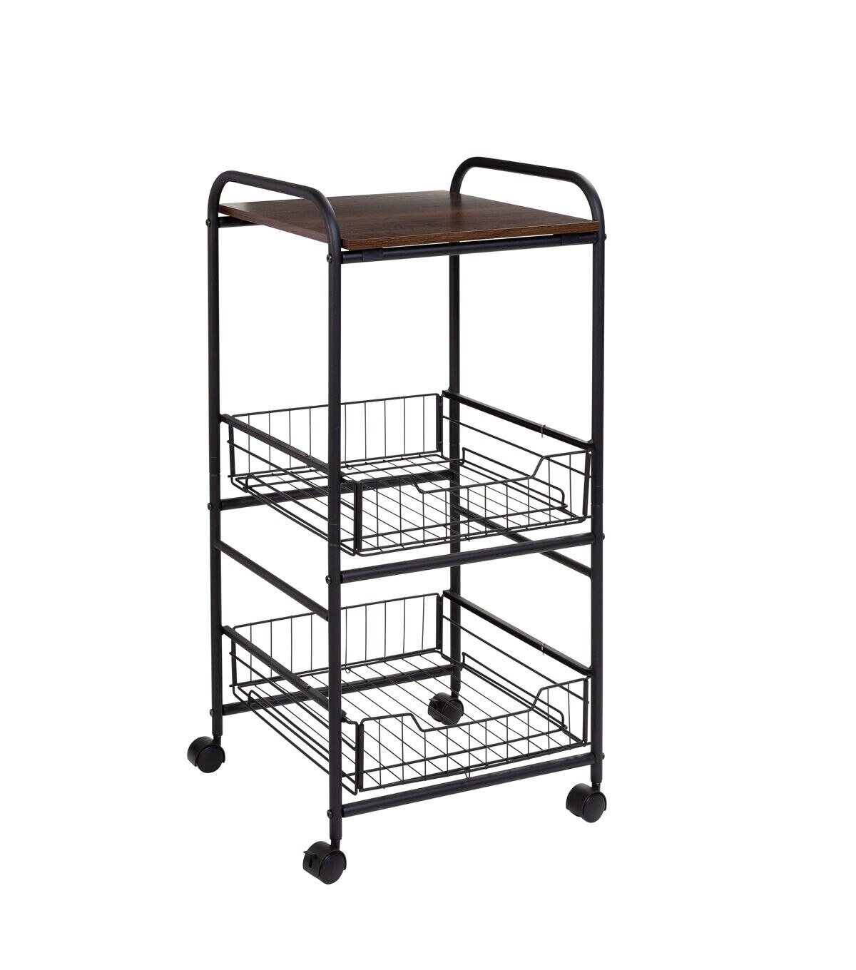 Slightly larger than a foot wide and deep, this sleek and narrow rolling cart is on a roll when it comes to organization! It easily slips into corners or unused space between furniture with its tiny footprint—adding 2 basket drawers and 1 shelf of versatile storage. The natural-toned wood top shelf is always at the ready for displaying your favorite plant or keeping office supplies in reach, while the pull-out baskets keep your items corralled and secure. When wheeled into the kitchen, the drawers can organize everything from produce to tall containers. And in other parts of the home, it is equally as useful. Roll it into the craft room to organize art supplies, the home office to boost storage, or the bathroom to sort beauty products. No matter where you use it, this chic wood and metal cart offers a timeless feel that transcends trends and offers endless years of aesthetically pleasing organization.