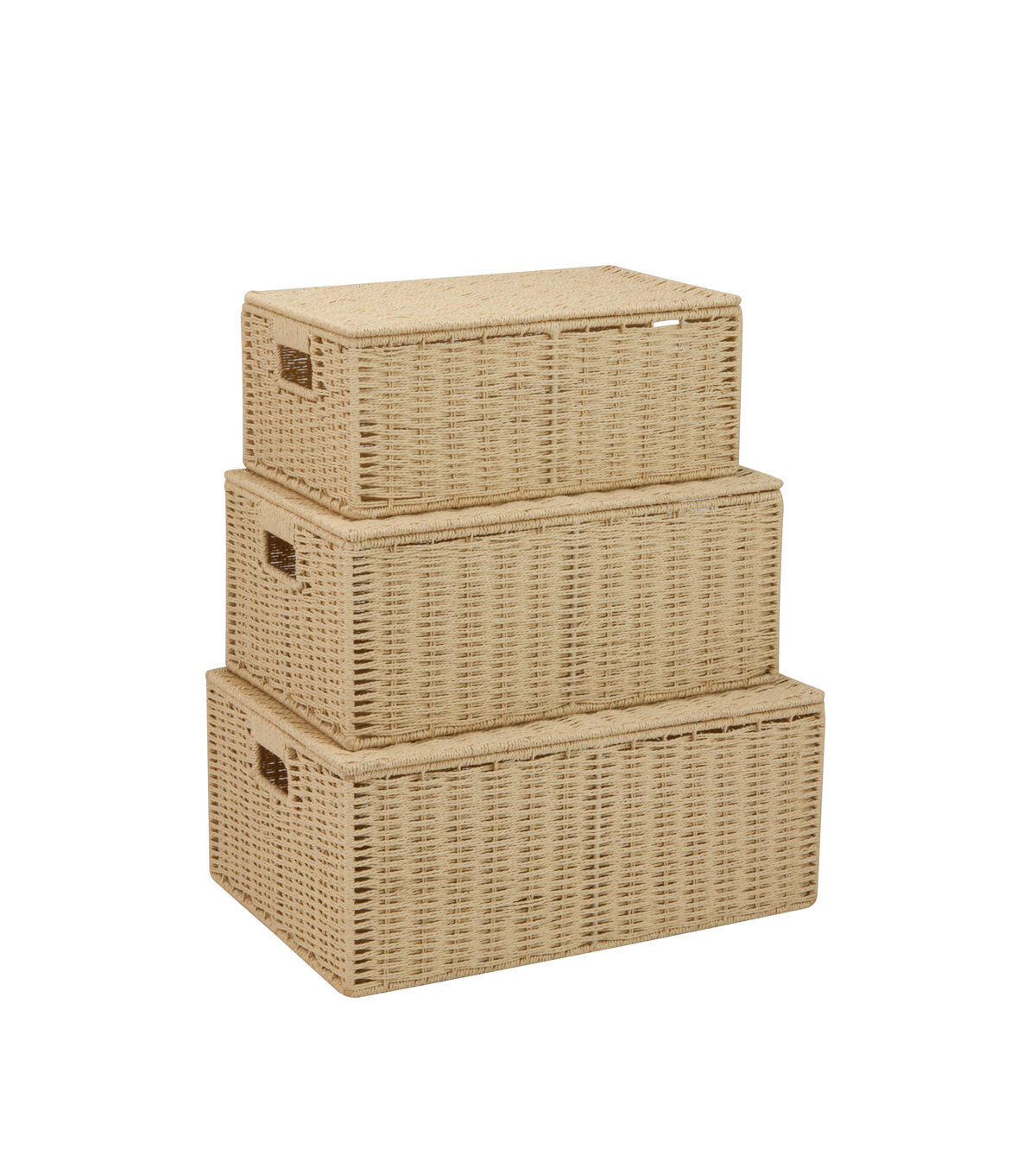 Keep clutter at bay with our three piece set of paper rope baskets. Available in three sizes, this set of baskets provides endless storage options for any room of the house, and the hinged lid keeps contents out of sight. Built-in carrying handles make for easy transport. Product Sizes: Small - 13.75"L x 8.5"W x 5.25"H; Medium - 15.5"L x 10.25"W x 6"H; Large - 17"L x 11.5"W x 6.5"H