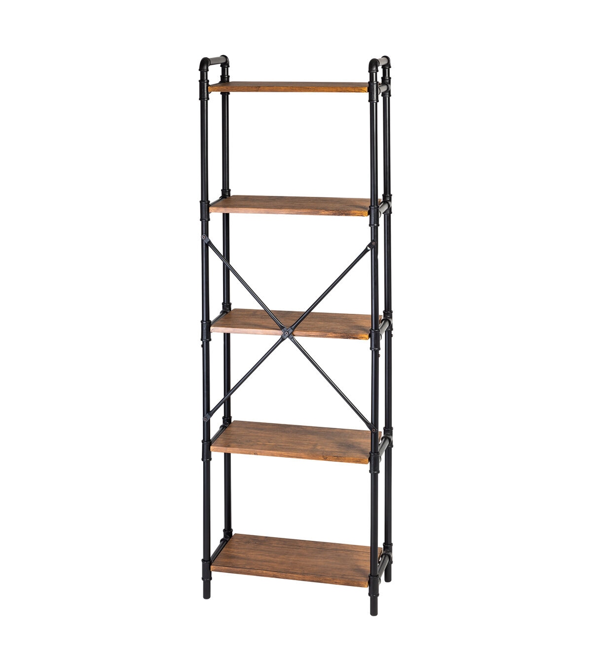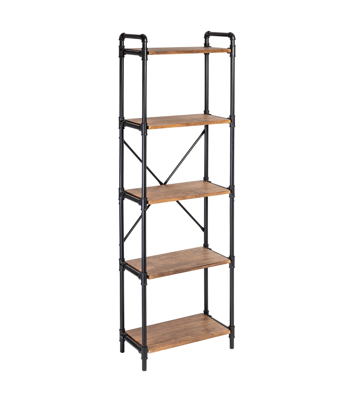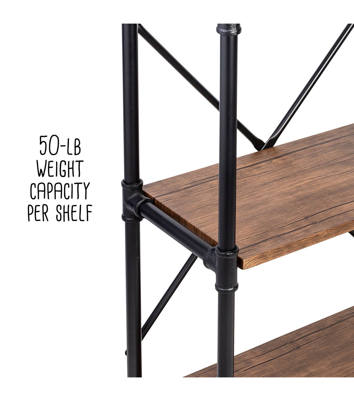 - Powder-coated black steel with MDF shelvesReinforced X-frame provides durability