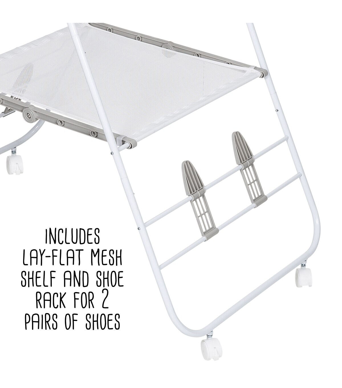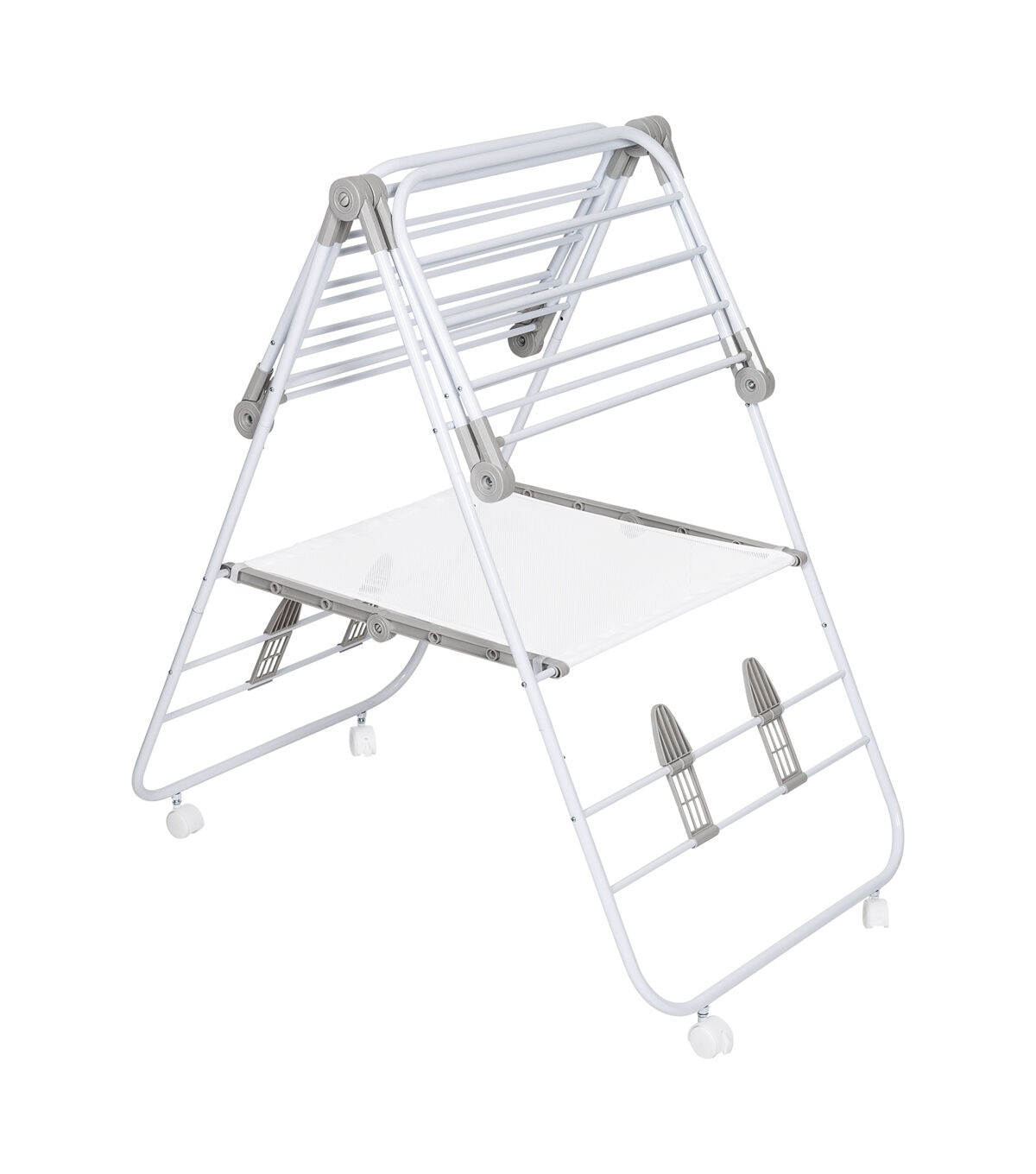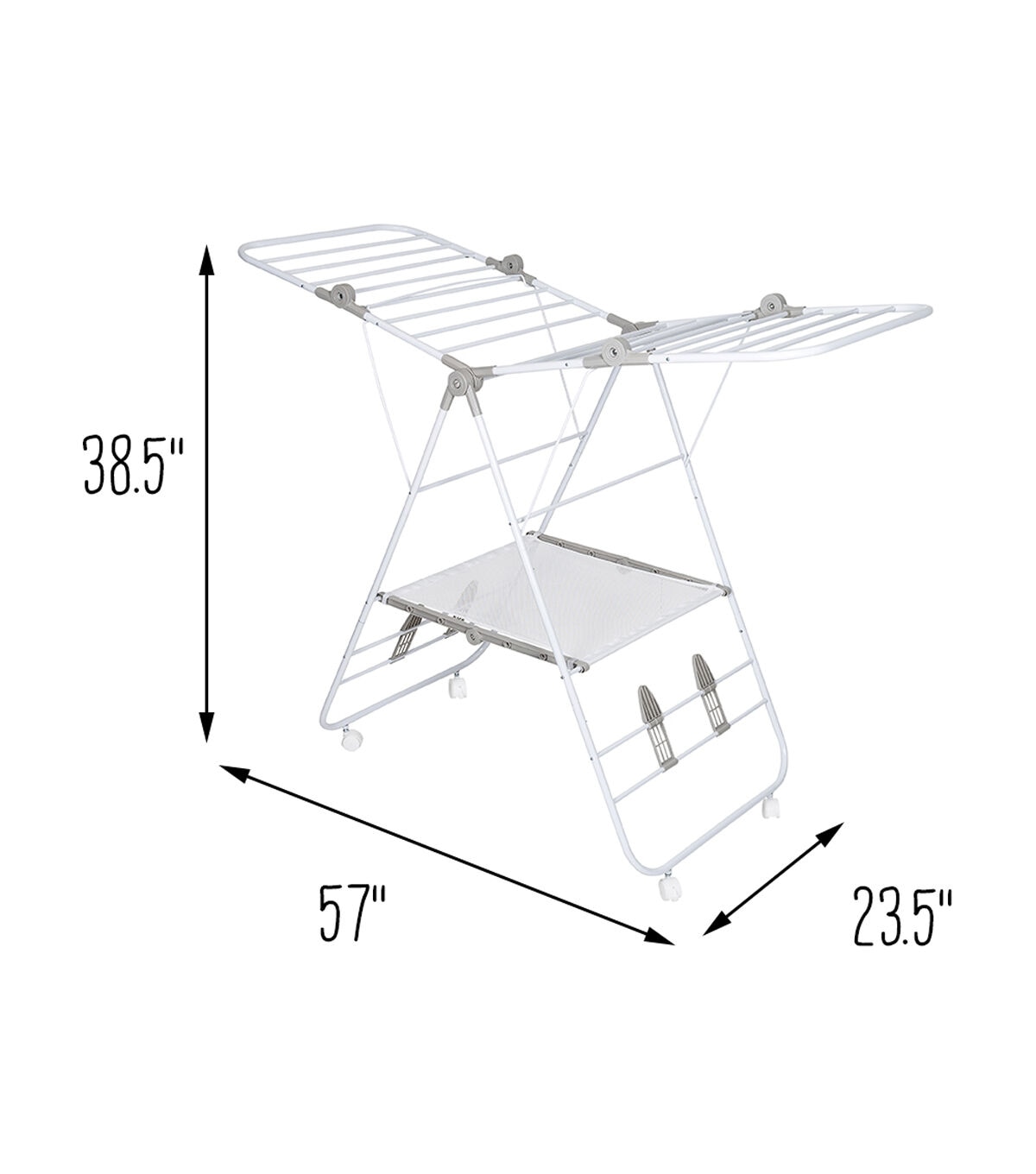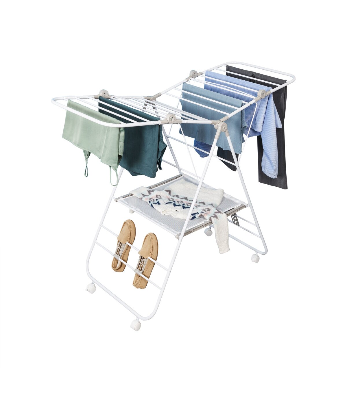 The only thing better than a large and versatile drying rack for clothes is one with wheels. A pair of wheels takes the portability of this wing drying rack soaring to new heights with their easy glide function that makes wheeling clothes from point A to B a breeze. Don’t worry; it still includes all the great features of the original Wing drying Rack with 42 linear feet of drying space that can hold 18 to 20 garments. The patented design also features smooth fold hinges that allow the wings to fold out into multiple positions for maximum drying space. It also boasts shoe racks that will keep your kicks in shape as they dry and a mesh shelf for those delicate pieces that need to be laid flat to dry. Once everything is ready to be folded, the A frame folds flat to 3” for easy storage.