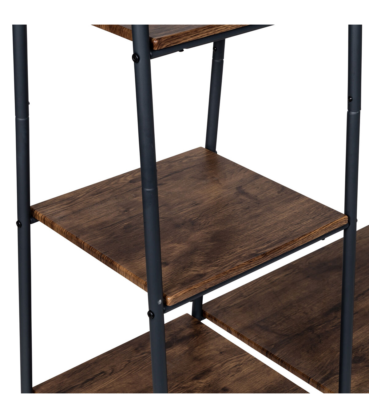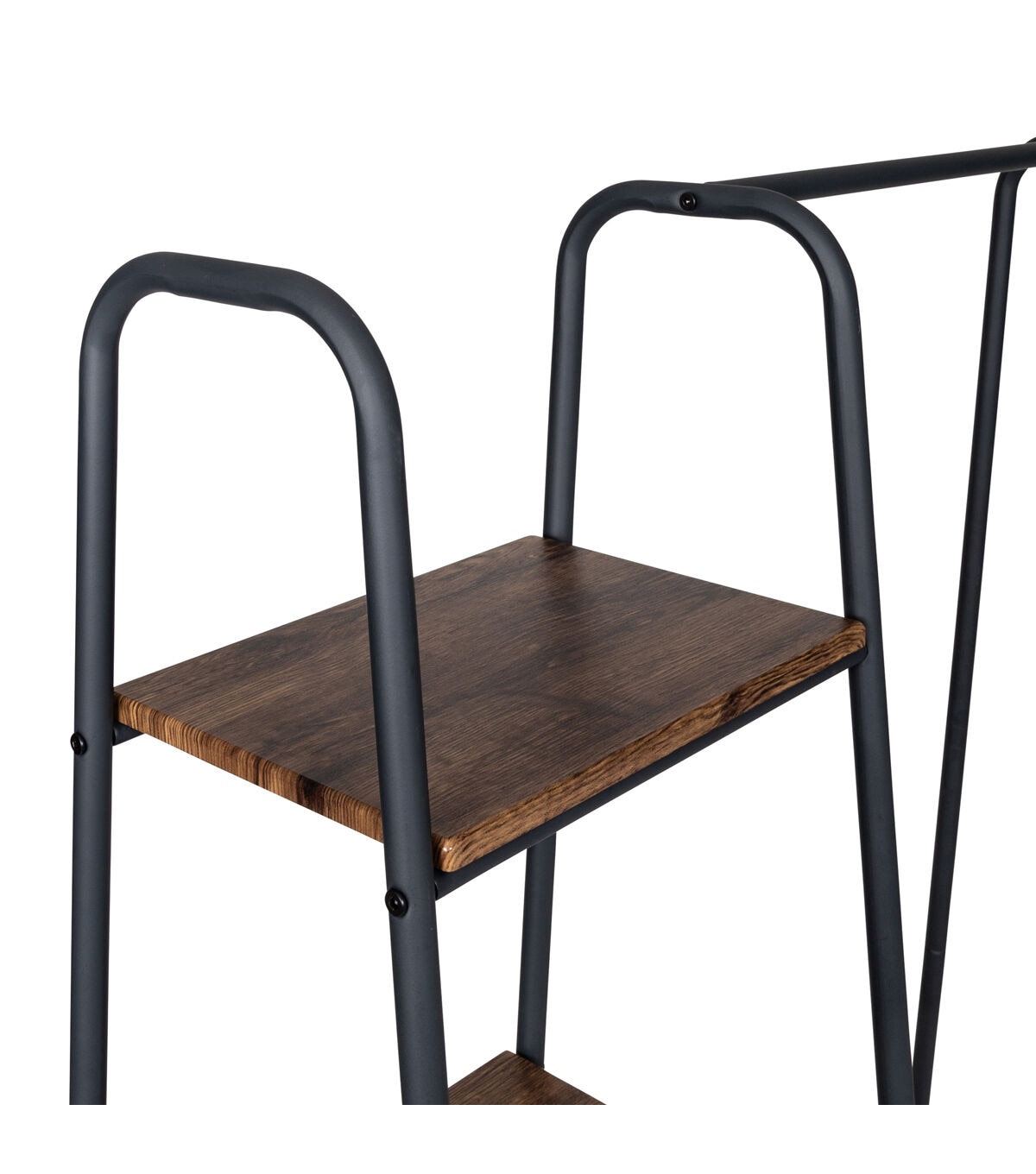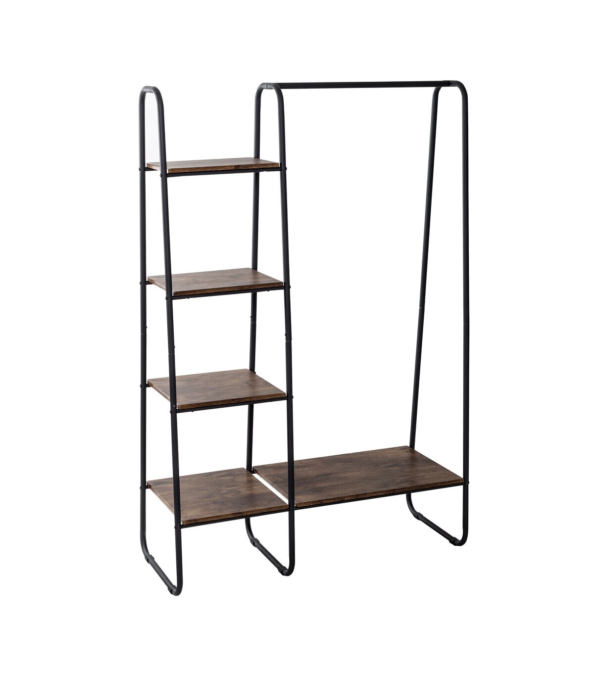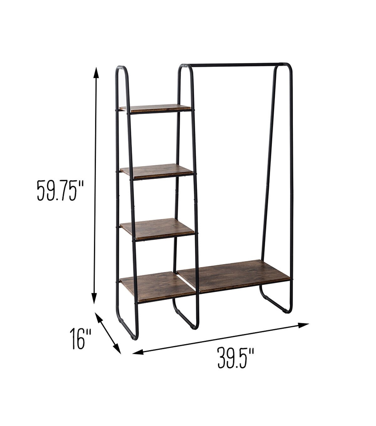 Artfully organize and show off your hanging clothes and folded garments with this black clothing rack. Its modern silhouette features rounded corners, a sturdy hanging bar for clothes, and 4 shelves. Shine a little light on this beauty and the color palette is equally as stunning. The assortment of natural-tone wood shelves not only boldly contrast the black frame but it gives this clothing display an extra kick of storage. The smaller shelves are a go-to for everything from organizing folded clothes to displaying accessories. Meanwhile, the large bottom shelf is the perfect place to slip storage baskets, shoes, or boots. This modern clothing rack instantly adds storage to both large and small spaces alike. Use it to plan your outfits, keep baby clothing in arm's reach, add clothing storage to a tiny apartment, or infuse your home with a touch of modern farmhouse style—the possibilities are endless!