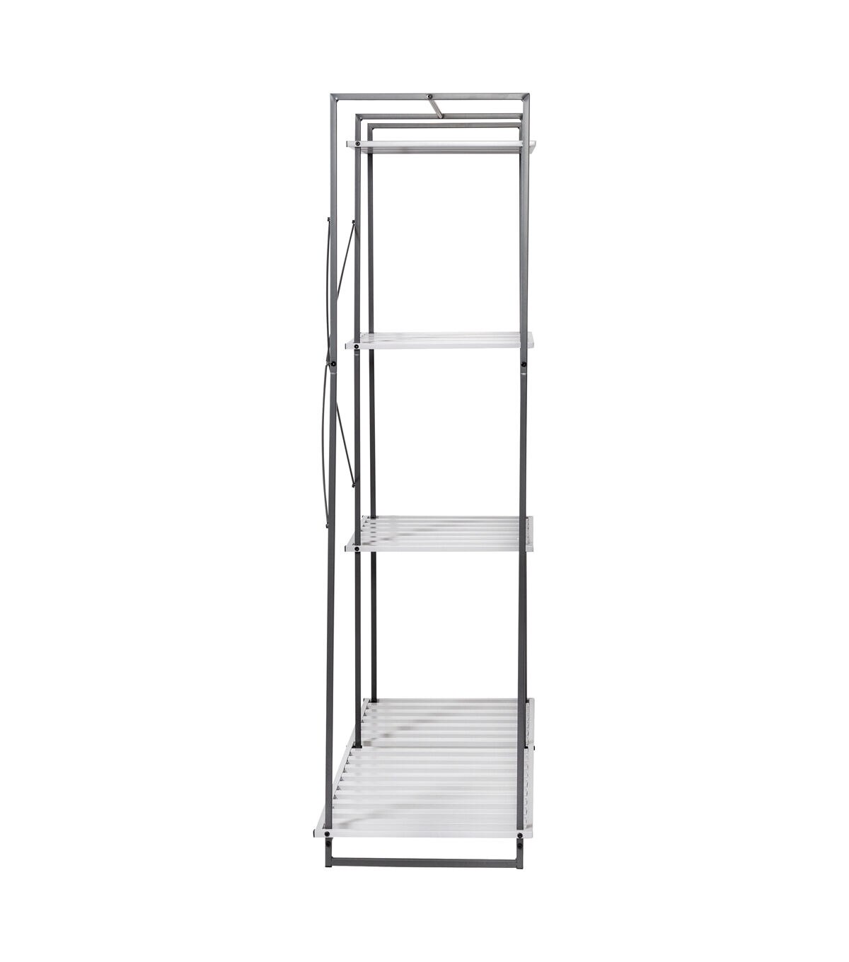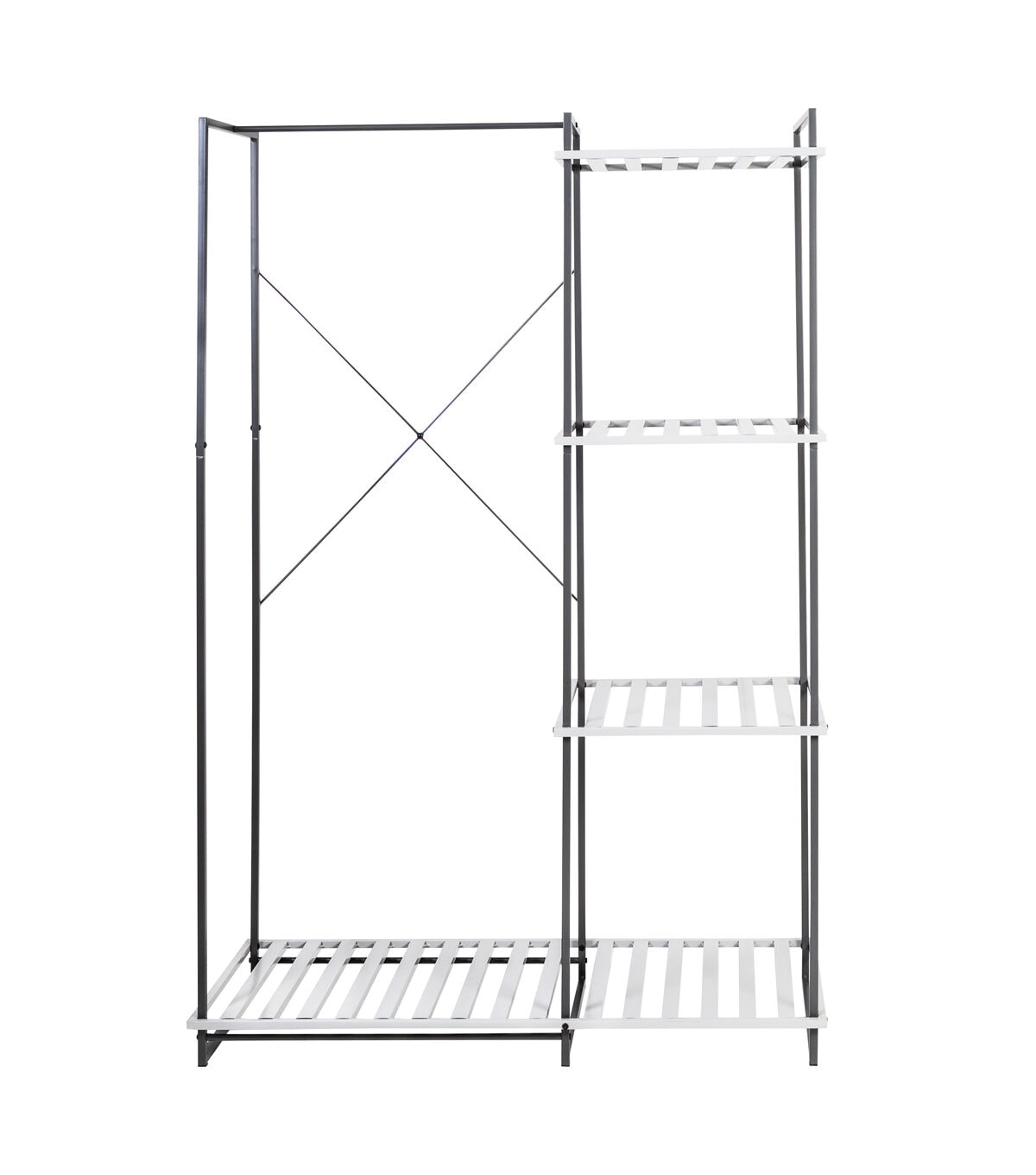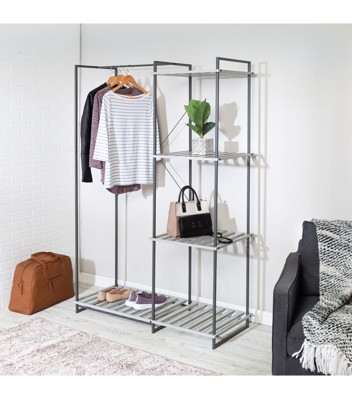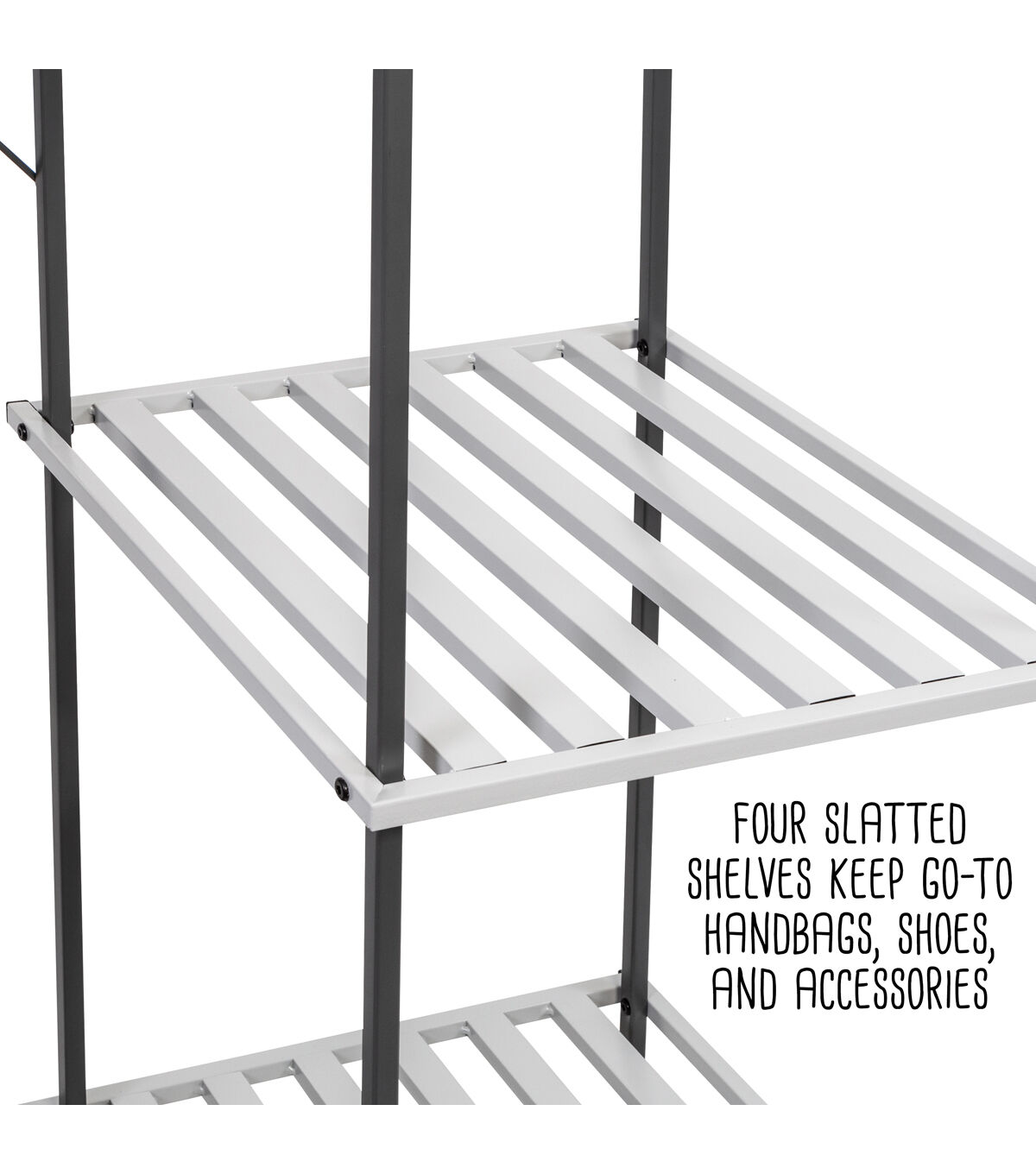 - Four slatted shelves keep go-to handbags, shoes, and accessories at hand