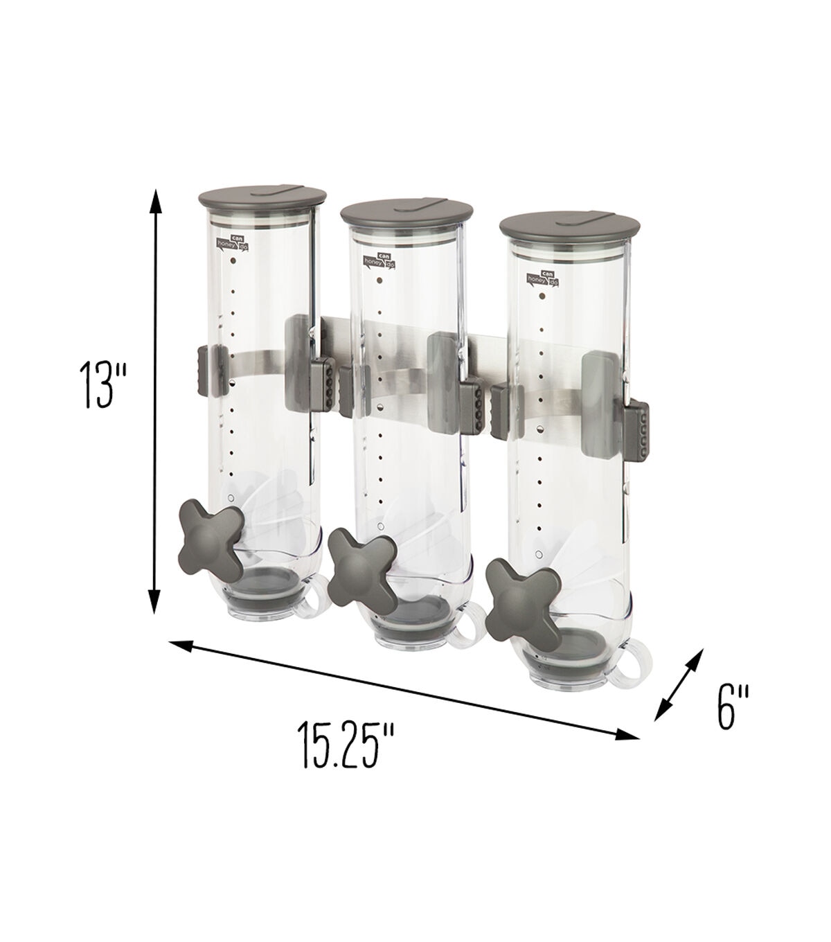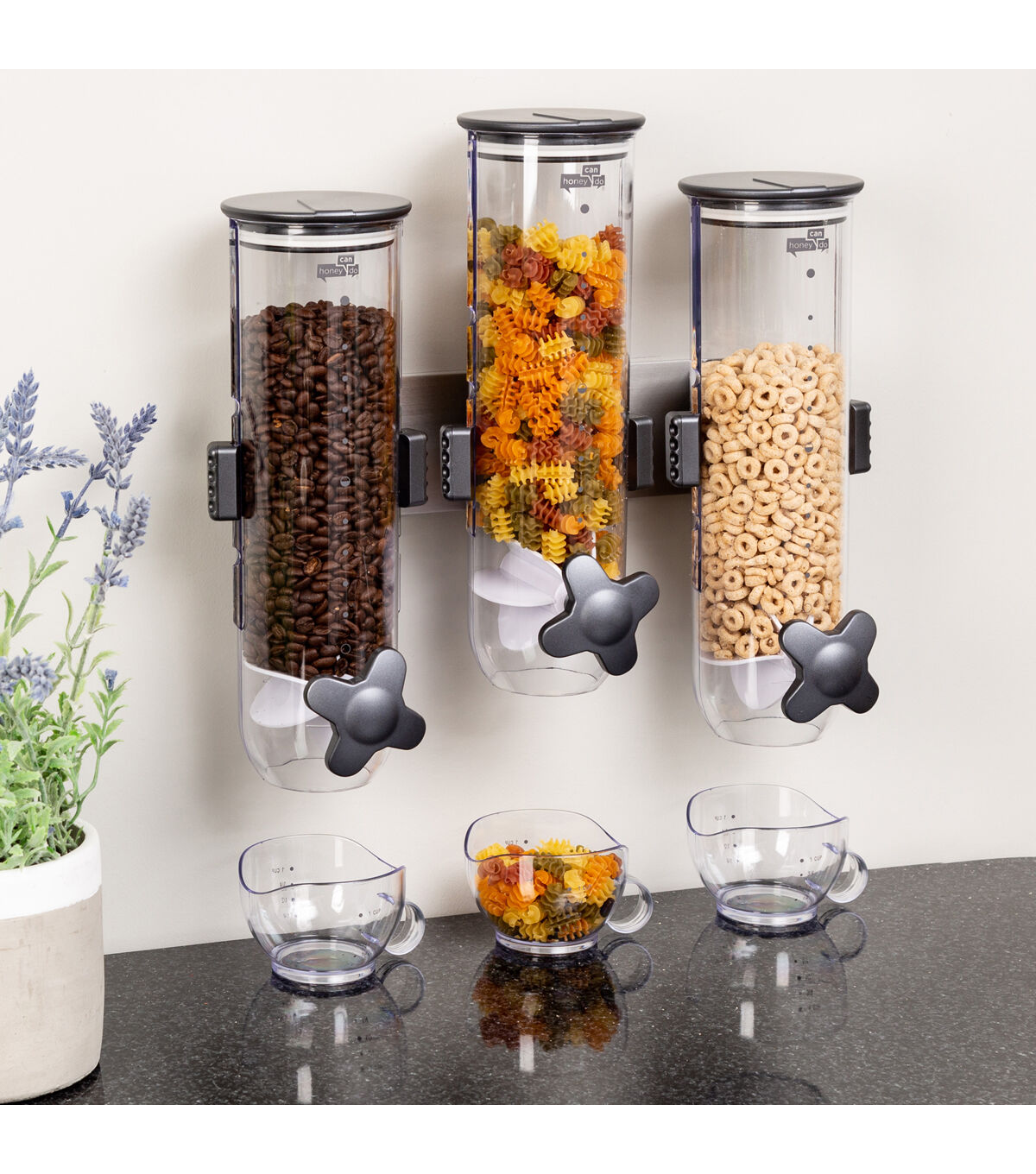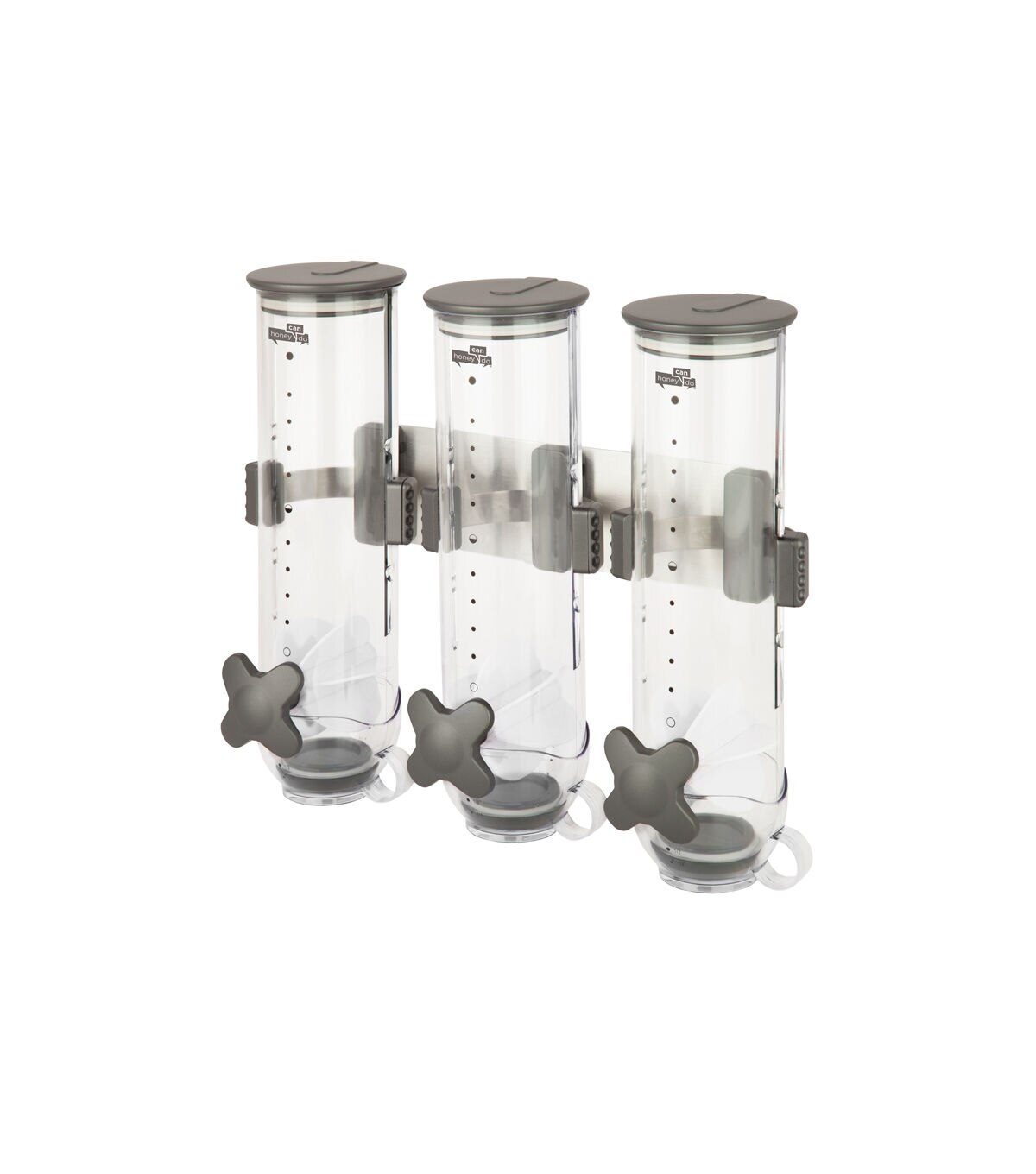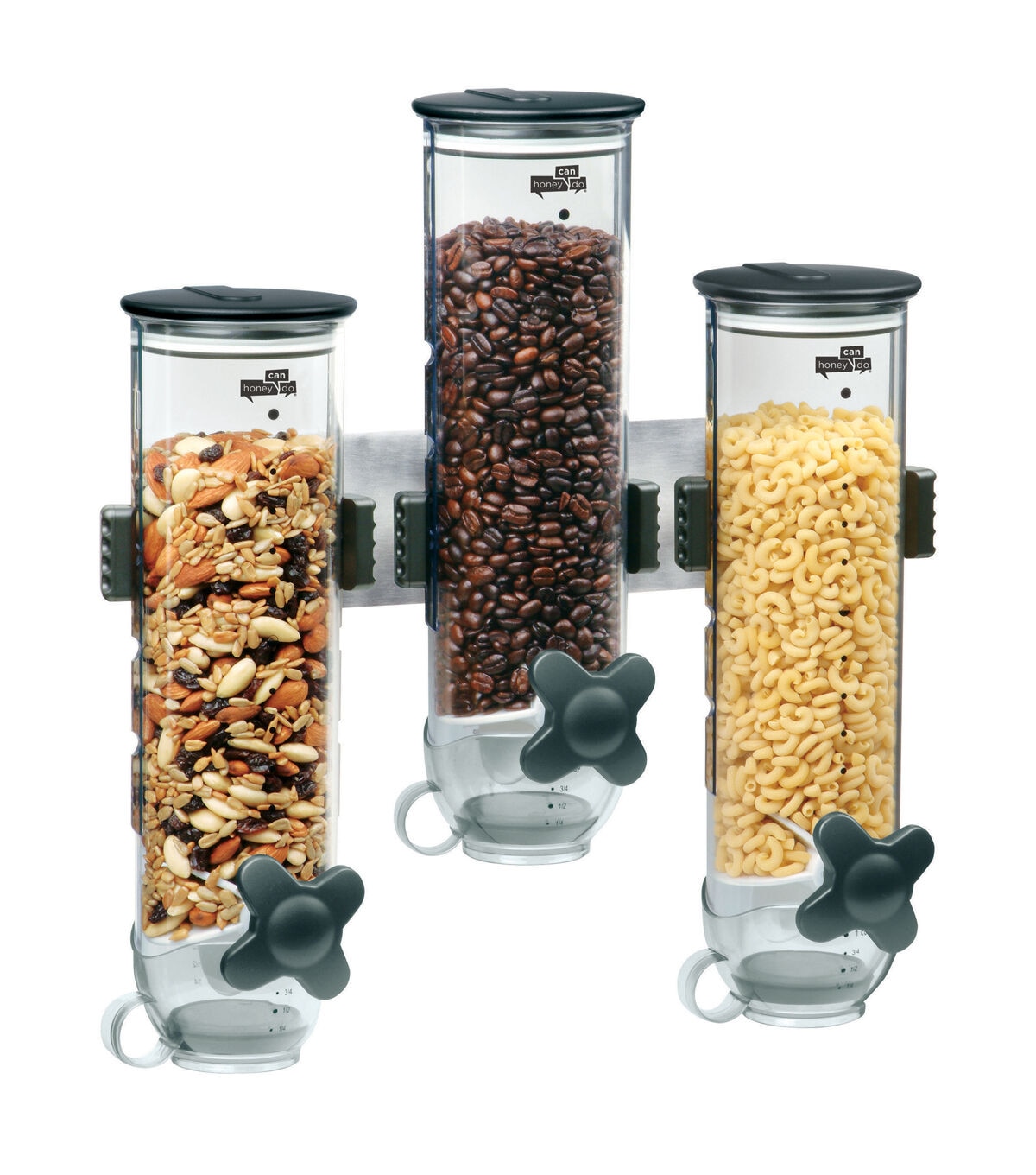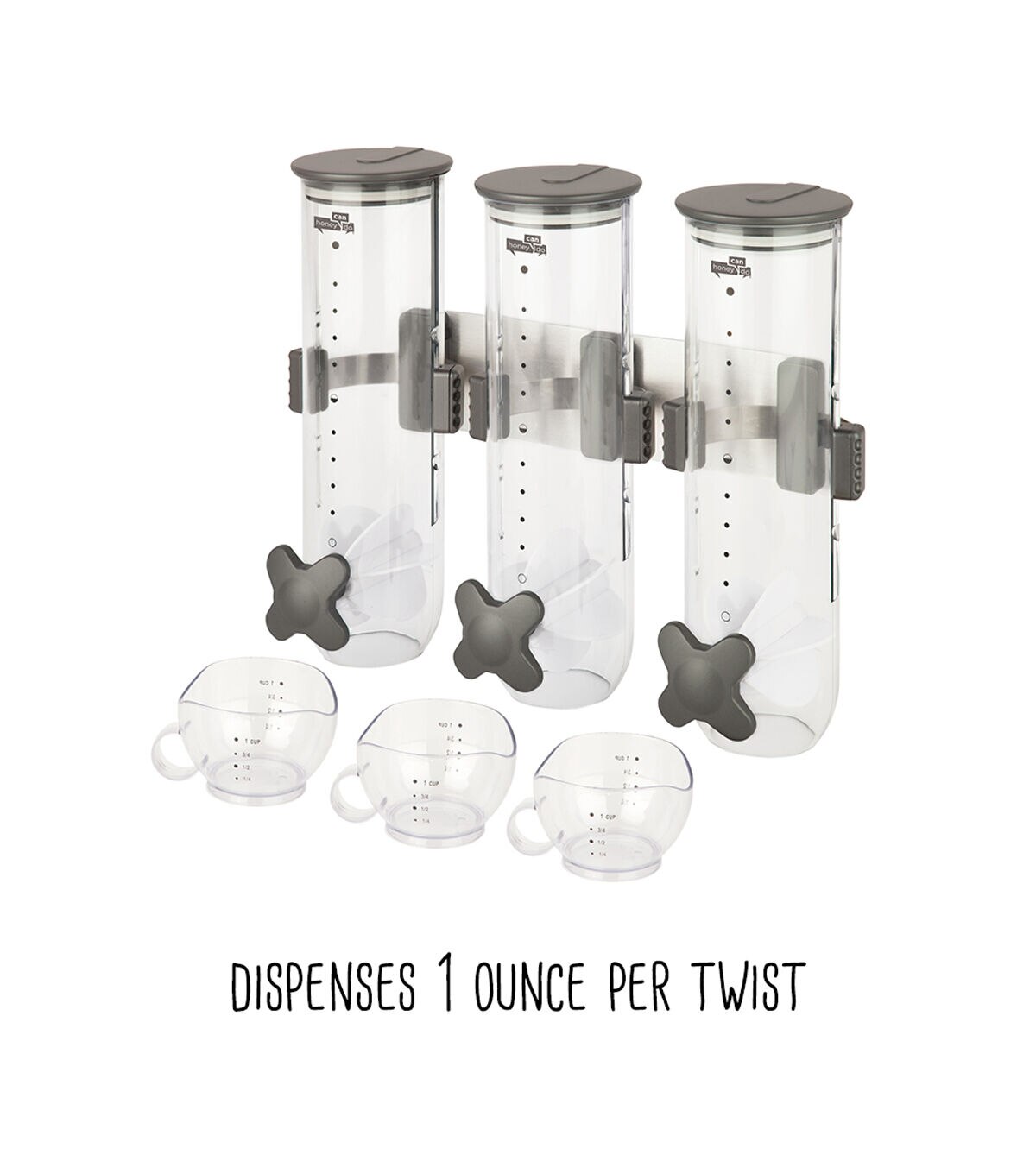 Honey-Can-Do KCH-06139 Smart Space Triple Canister Wall-Mounted Dispenser, Clear. Suitable for dry foods such as cereal, oatmeal, candy, granola, nuts and more, this convenient storage and portion control solution dispenses approximately one ounce with each twist. Each canister holds 13 ounces of dry food. Designed to preserve freshness for up to 45 days, this unit is perfect for the health/weight-conscious and for controlling stacking. Includes screws and mounting guide. Can also be mounted with heavy-duty double sided foam tape.