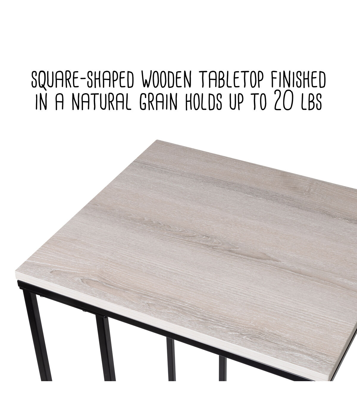 - Square-shaped wooden tabletop finished in a natural grain holds up to 20 lbs