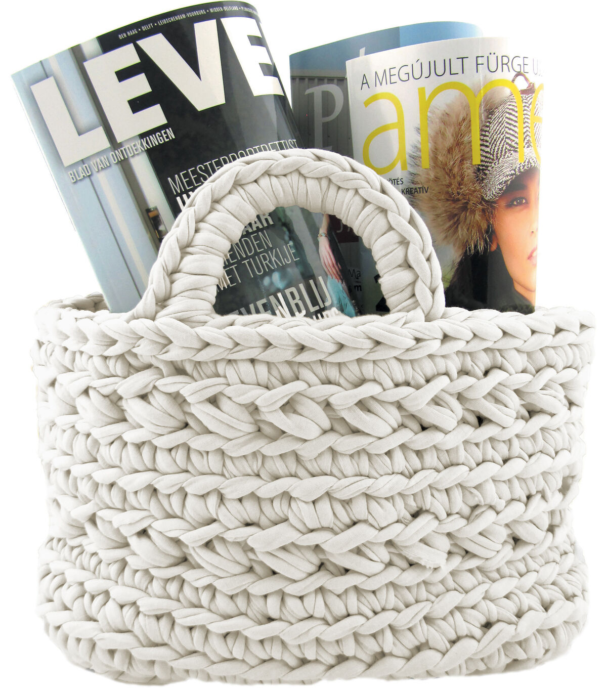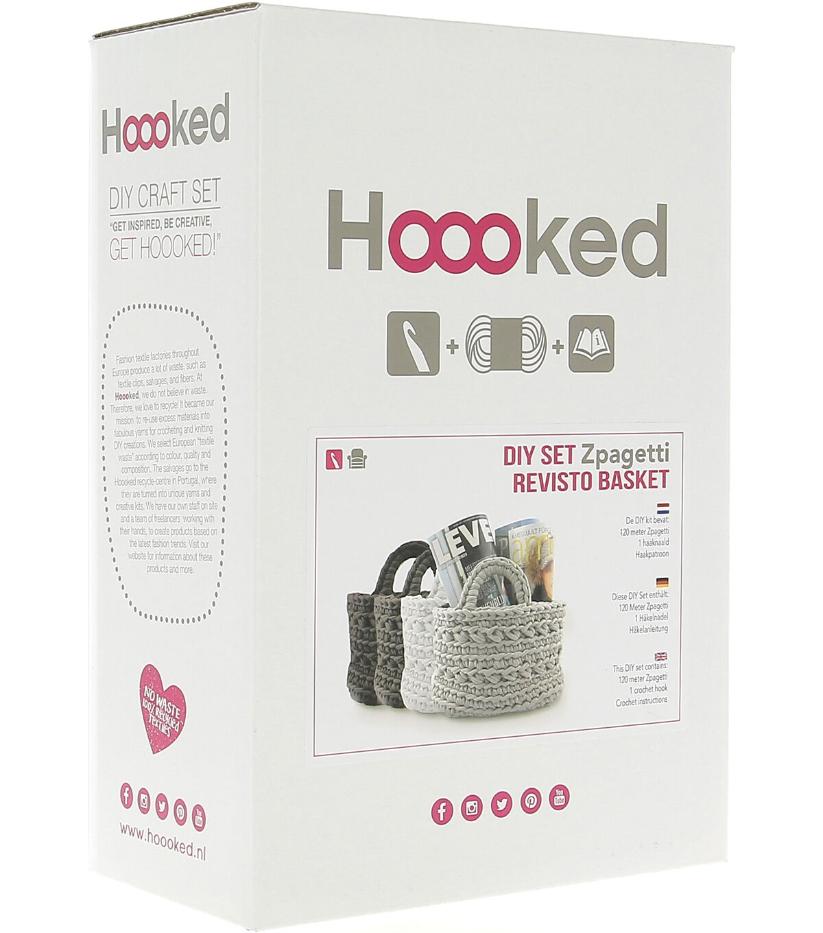 Create a lovely crochet basket with the Hoooked Zpagetti Revisto Basket DIY Crochet Kit-Off White. Crochet baskets can be used to create unique storage solutions for your home. This hanging basket personalizes your organizing space, and makes a beautiful statement in your interior. The super chunky t-shirt yarns let you finish this project in just a few hours. This kit includes one roll of Zpagetti yarn or two half cones, a bamboo crochet hook, pattern instructions, accessories and deluxe gift packaging.