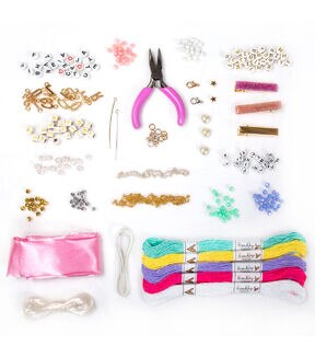 - Includes: 340 Colorful Round Faceted Beads, 30 Pearl Beads, 16 Jump Rings (Silver & Gold), 5 Skeins of Clear Elastic Cording, 1 Gold Metal Chain (16 in.), Purple Chain Nose Pliers, 2 Eye Pins (Gold & Silver), 152 Alphabet Beads, 5 Skeins of Friendship Thread (1 White, 1 Yellow, 1 Blue, 1 Magenta, 1 Teal) 8.75 yds. Each, Pre-Cut & Stitched Satin Scrunchie Fabric (Pink), 38 Golden Alphabet Charms, 1 Silver Metal Chain (8 in.), 5 Pearl Heart Charms, 3 Hair Clips (Bright Pink, Light Pink, Gold), 2 Metallic Star Beads, 6 Lobster Clasps (Silver & Gold), Easy-to-Follow Instructions
