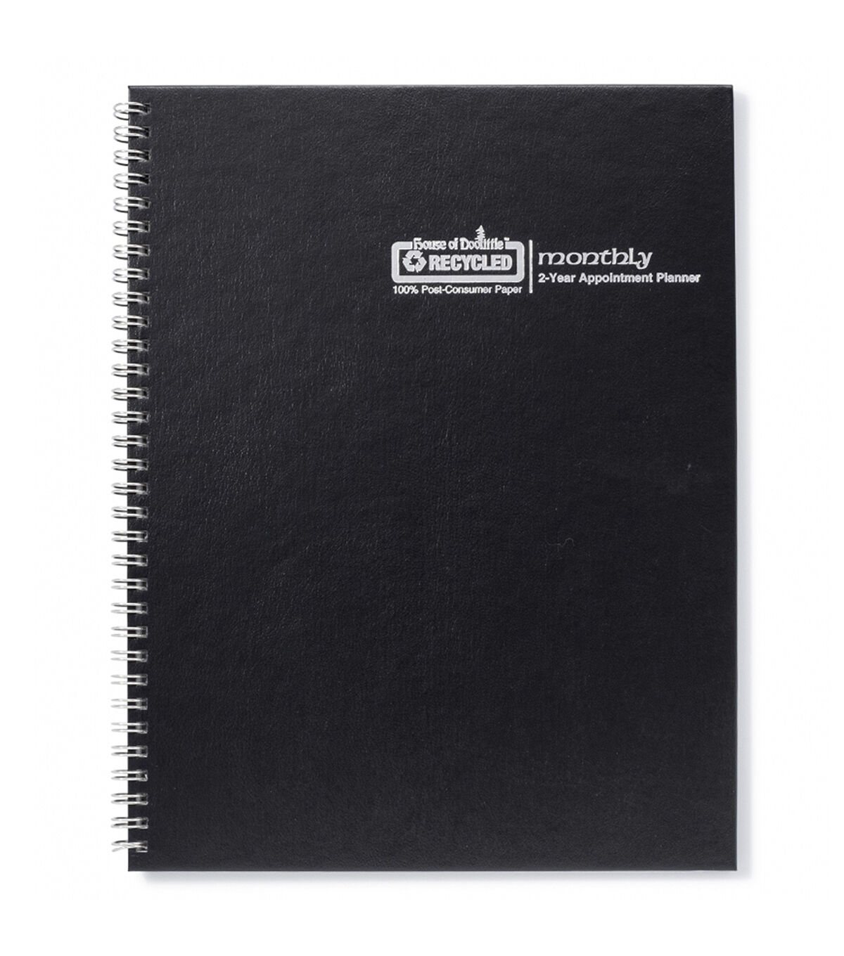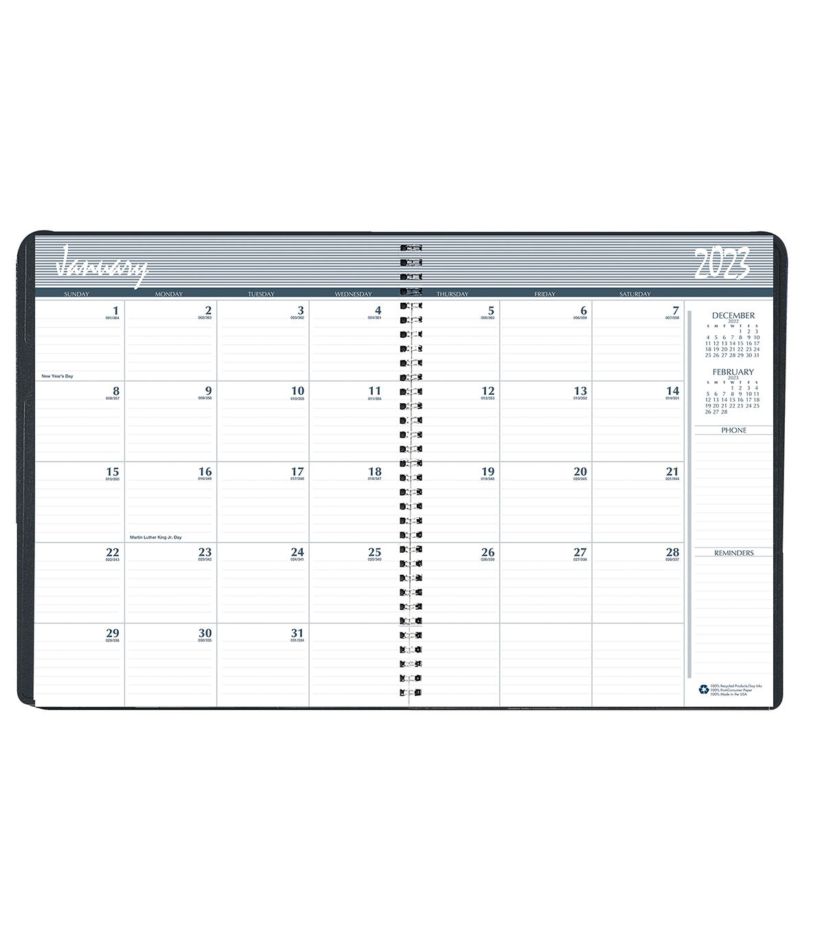 24 Month: January - December. Black embossed simulated leather cover. Block size: 1 3/4" x 1 3/4". One month per two-page spread. Printed on 100% post-consumer recycled paper with soy ink - Made in the USA. Includes Julian dates and days remaining with space for notes. Previous and the next month reference calendar on each month. Lightly ruled daily blocks - Measures 8 1/2" x 11"