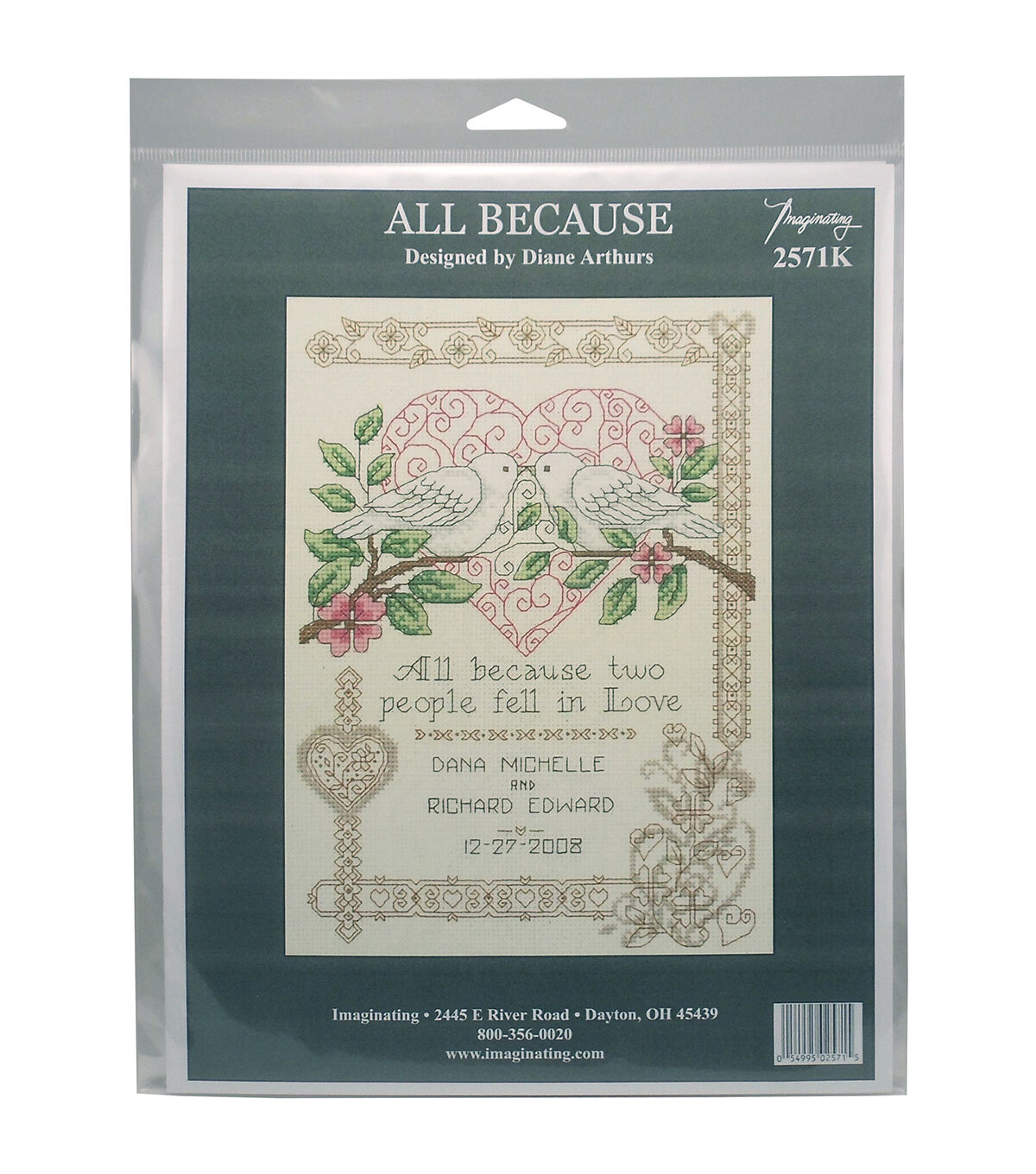 Elegant and charming, the Imaginating All Because Wedding Record Counted Cross Stitch Kit will add a unique touch to your decor. Celebrate the sacred bond of marriage by commemorating the date and weaving the name of the couple in this lovely counted cross stitch kit. This package contains 14 count beige fabric, floss, one needle, one layout page and easy to follow instructions.