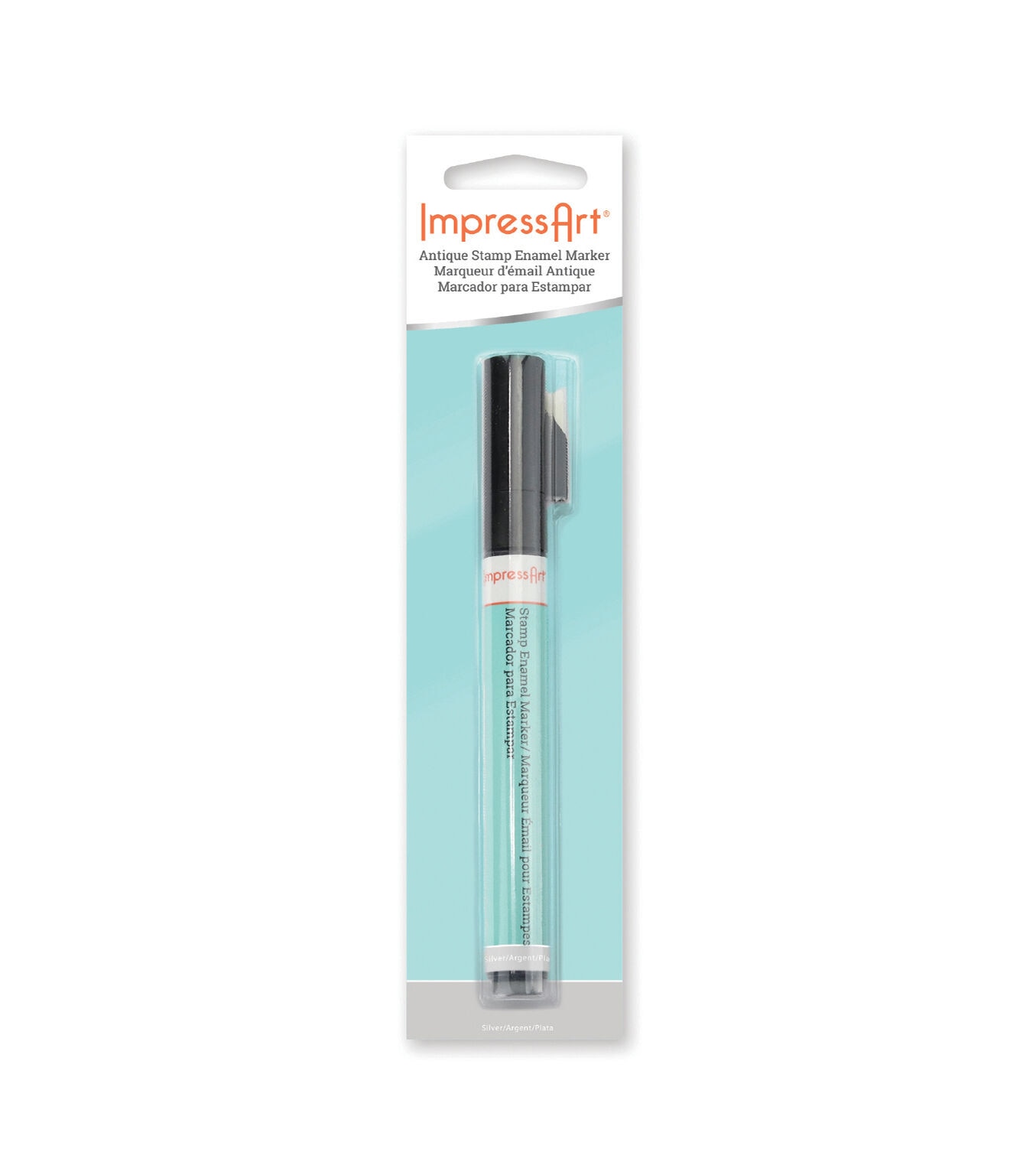 The ImpressArt Antique Stamp Enamel Marker-Silver consists of acrylic ink. You can use it to darken stamped impressions so that your designs can be seen clearly. This convenient applicator marker makes highlighting impressions quicker, easier and cleaner. Simply run the tip of your marker over the stamped area from left to right, wait 1 to 3 minutes and wipe away excess ink with a soft cloth.