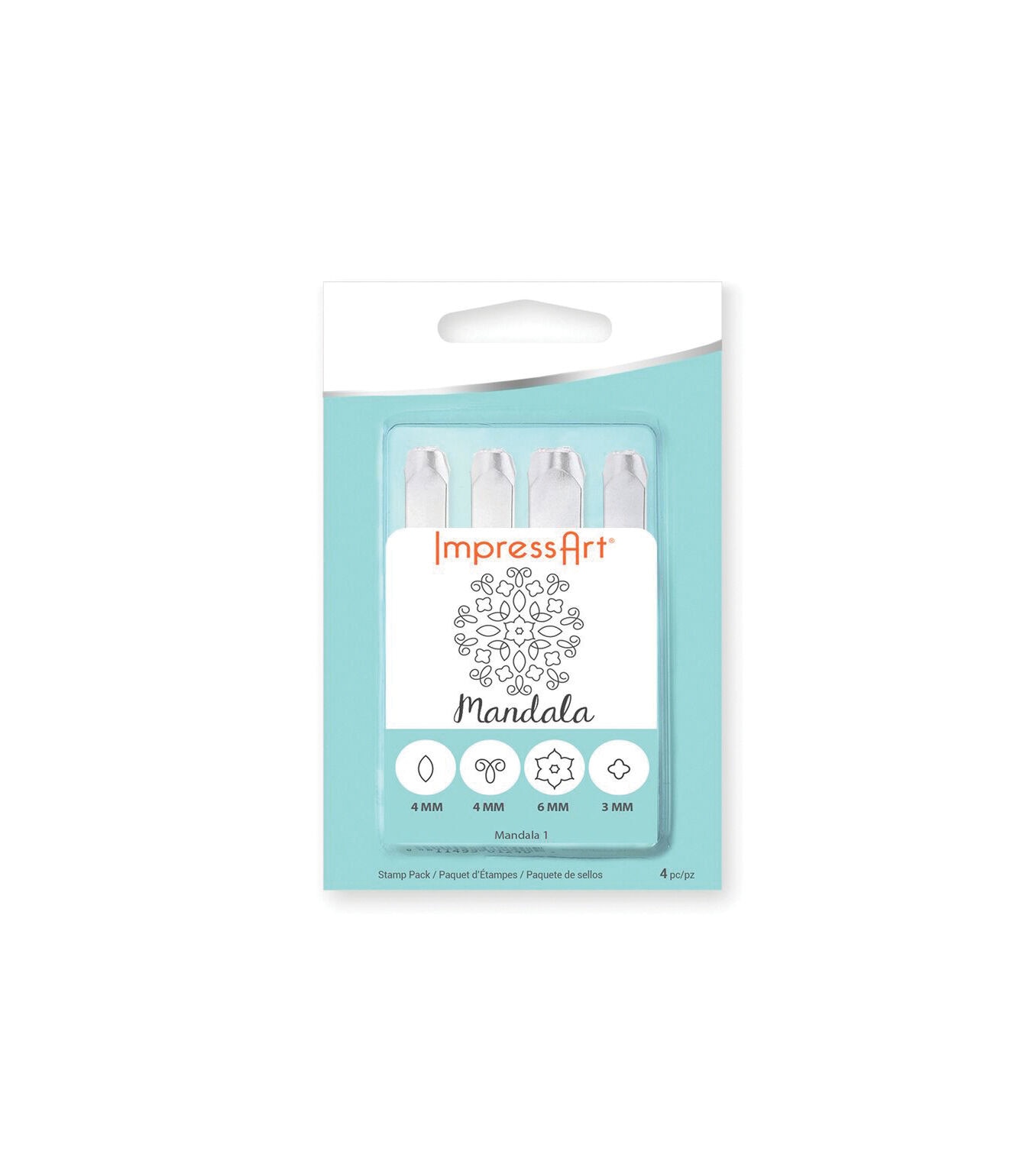 The professional quality ImpressArt Series 1 Stamp Pack-Mandala is manufactured to the highest standard for durability and alignment. Designs are precision-cut from carbon tool steel, hardened to last project after project. These stamps have an oil-free finish to protect against rust, and the side of each stamp is labeled with the design for easy identification. This pack consists of stamps in shapes including large flower, small petals and swirl.