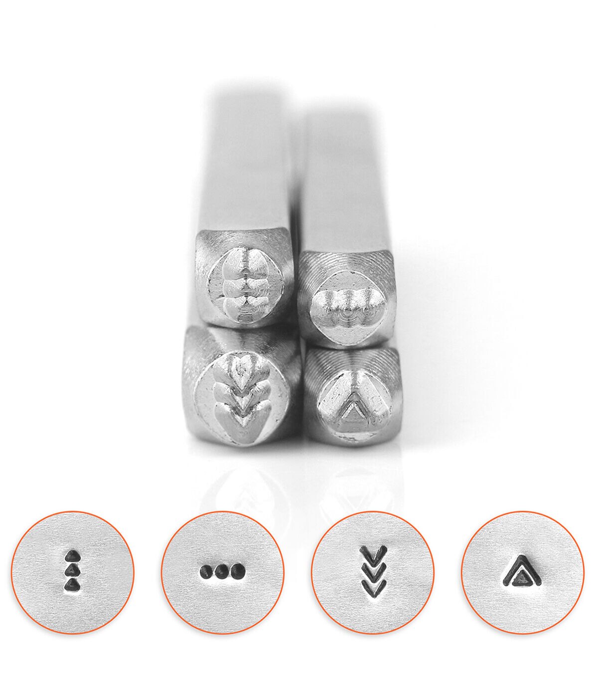 The professional quality ImpressArt Series 4 Stamp Pack-Mandala are manufactured to the highest standard for durability and alignment. Designs are precision-cut from carbon tool steel, hardened to last project after project. These stamps have an oil-free finish to protect against rust, and the side of the stamp is labeled with the design for easy identification. This pack consists of stamps in shapes including double triangle, arrows and dots.
