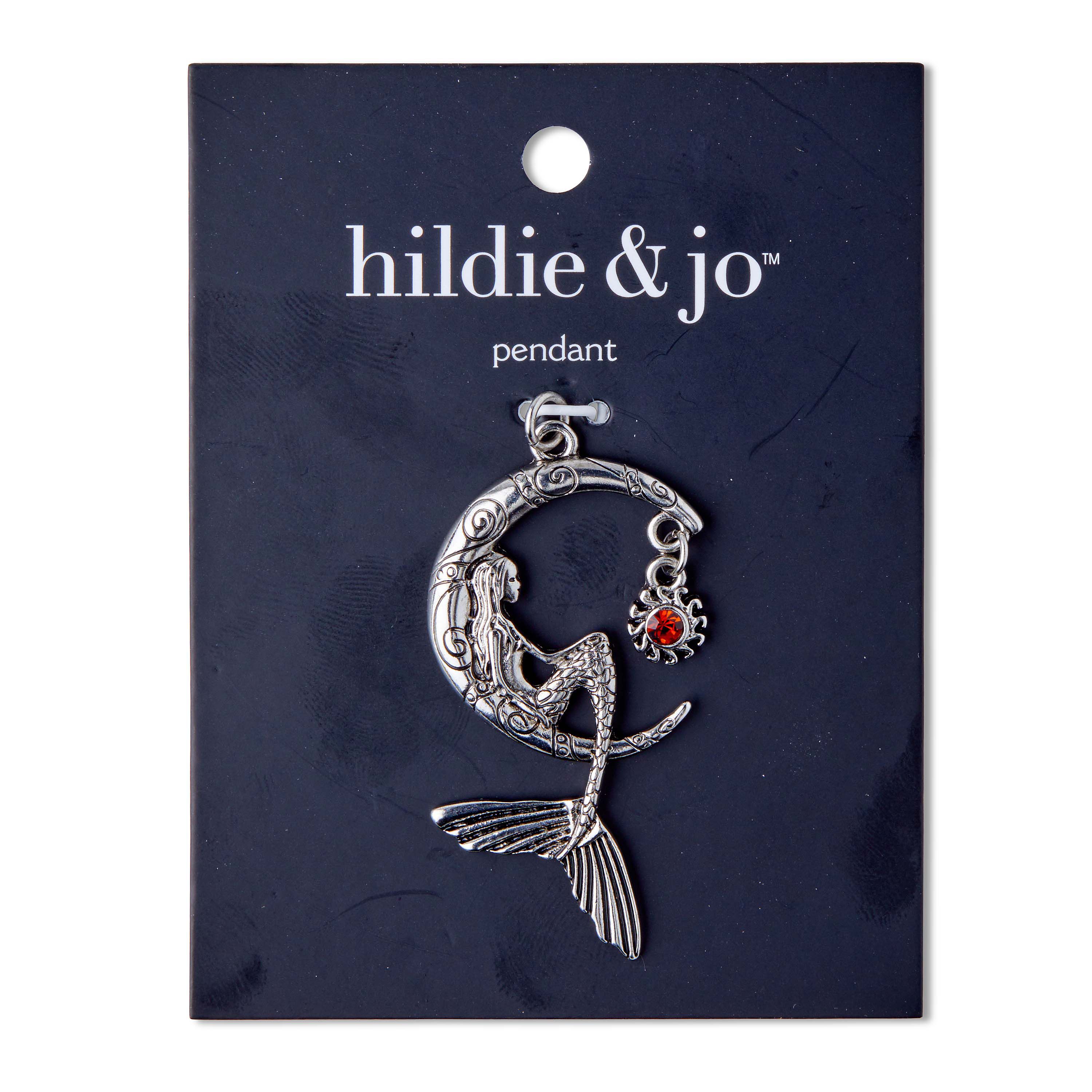 A beautiful little mermaid graces this hildie & jo Zinc Alloy, Iron & Glass Moon with Beauty Pendant for a striking look. The lone crystal encased in a decorative circle adds sparkle and color to this textured moon pendant.