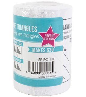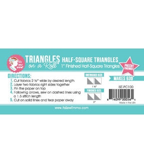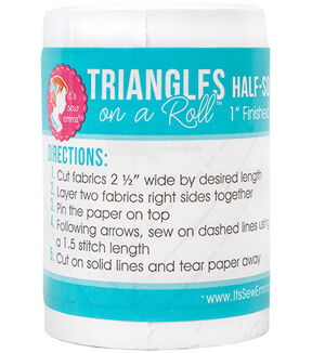 The Jelly roll 1 inch Half Square Triangles paper is designed specifically for 2.5 inch precut strips. Using the triangle paper roll allows you to make 1 inch finished half square triangles, while the paper stabilizes fabrics for quicker work and less fuss. This package contains one roll that will make 630 half square triangle units. Made in USA.