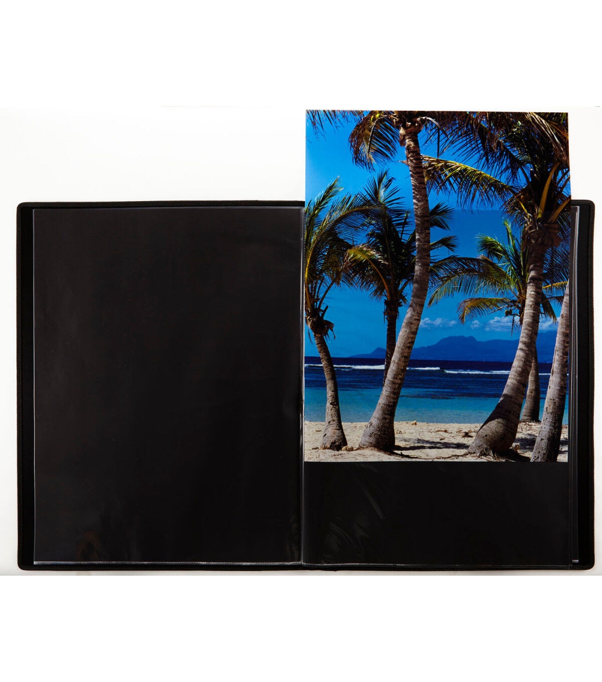 This presentation book is archival safe for all your art storage needs. It features acid-free black mounting paper that serves as attractive backgrounds for photographs, documents and fine art. The top-loading, clear polypropylene sheets will not stick to copier toner, ensuring that whatever you choose to display remains in tact and protected. The durable polypropylene cover resists moisture and dust and features stylish nylon stitching.
