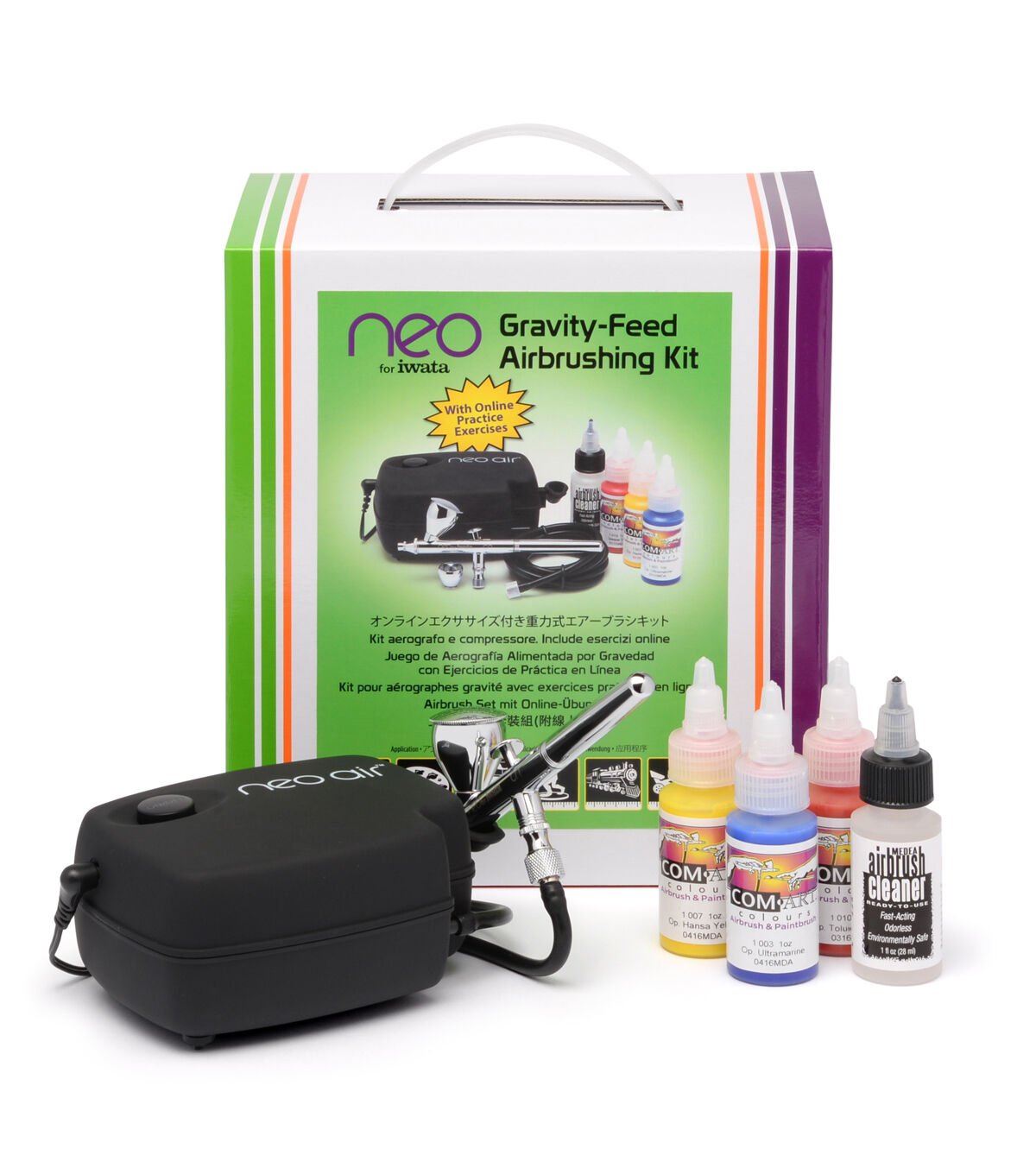 NEO for Iwata Gravity Feed Airbrushing Kit with NEO CN is perfect for the first time or occasional user because it delivers soft, effortless coverage and quality atomization at low air pressures. Packaged in a handle box, it's the perfect, portable airbrush kit and makes a great gift!This kit features the NEO for Iwata CN airbrush which is designed to deliver soft, effortless coverage at low air pressures. This makes it an easy choice for many types of spray applications. This airbrush has a detachable 0.24 oz / 7 ml fluid cup with lid that is large enough for color mixing and an additional 0.05 oz / 1.50 ml color cup that is ideal when using small amounts of spray medium. The NEO CN works beautifully with the NEO Air compressor, an ultra quiet miniature airbrush compressor that is ideal for light-use low pressure applications with a working pressure of 4-15 psi. This unit weighs less than a pound and comes with a set of international adaptors so it can be used anywhere in the world. The detachable airbrush holder provides a safe and convenient place to rest your airbrush when you're not spraying. The single on/off switch offers three air pressure settings allowing you to subtly adjust the air pressure to the perfect amount. To help you get started we include several bottles of our airbrush ready Com Art paints as well as some Medea Airbrush Cleaner. To complete the experience, we provide access to full color online instructions and exercises designed by noted artist and airbrush instructor Robert Paschal.
