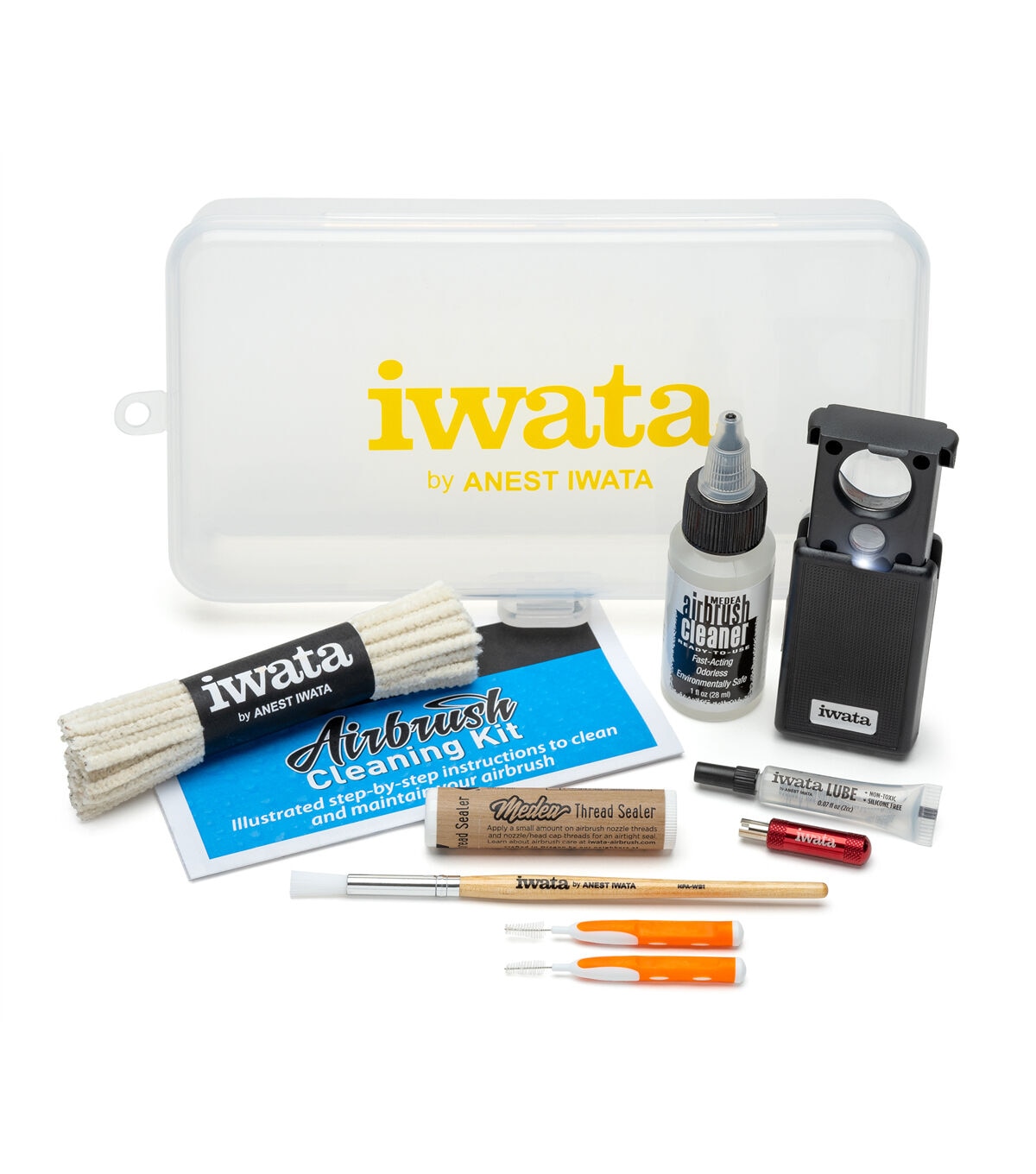 Iwata Airbrush Cleaning Kit includes the same great tools Iwata Technicians use to clean and restore airbrushes to perfect working conditioning. Containing all the essential cleaning items including; Medea Airbrush Cleaner, Medea Thread Sealer, Extra Small Cleaning Brushes, Non-Shedding Pipe Cleaners, Iwata Nozzle Wrench, Iwata LED Magnifier, Iwata Premium Airbrush Lubricant and Illustrated Step-by-step cleaning instructions you will be well on your way to perfect airbrush maintenance any time.
