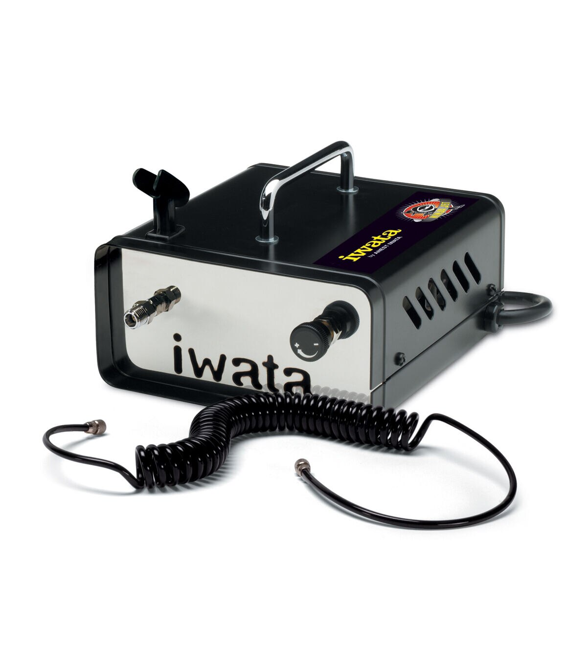 The Iwata Ninja Jet compressor proves ideal for the hobbyist or professional user who needs a small, reliable source of air. The Ninja Jet's quiet operation makes it ideal for use in small work spaces and it is capable of powering most gravity feed airbrushes for low pressure applications of 1 to 15 psi. This compressor is simple to operate and requires zero maintenance providing easy, reliable air when you need it. The air regulator knob allows you to adjust the working pressure so you can find the best spray for your airbrush and project. The built-in airbrush holder provides a safe and convenient place to rest your airbrush when you are not spraying. Includes a durable polyurethane cobra coil airbrush hose for Iwata airbrushes. Also included are air hose adaptors for Badger, Aztek and Paasche brand airbrushes and a detailed operation manual.