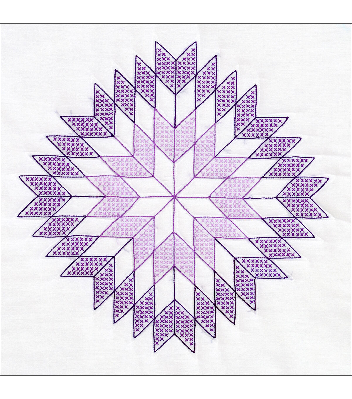 Jack Dempsey-Stamped White Quilt Blocks. Create a beautiful quilt top using this great kit. It consists of individual squares to stitch and join together to form a quilt top. The stitching designs have been stamped using ink that washes away with any liquid and the fabric is a cotton/poly blend broadcloth. This package contains six 18x18 inch quilt squares, instructions and a complete list of DMC floss requirements. Material for stripping, batting, backing, hoop, needle, thread and floss all sold separately. Design: Lone Star. Made in USA.