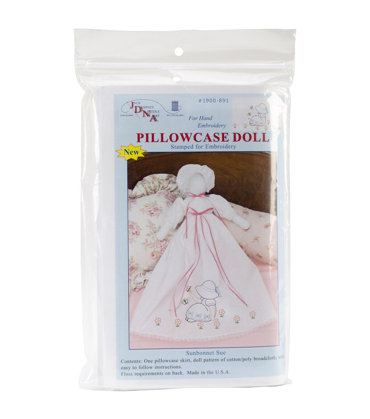 With the Jack Dempsey Stamped White Pillowcase Doll Kit, you can create an endearing pillowcase doll that will appeal to kids of all ages. Stamped intricate design on the cotton/poly blend broadcloth pillowcase doll dress and bonnet in this set are completely washable and serve as a useful guideline for stitching. The package includes care and sewing instructions along with a list of DMC floss requirements.