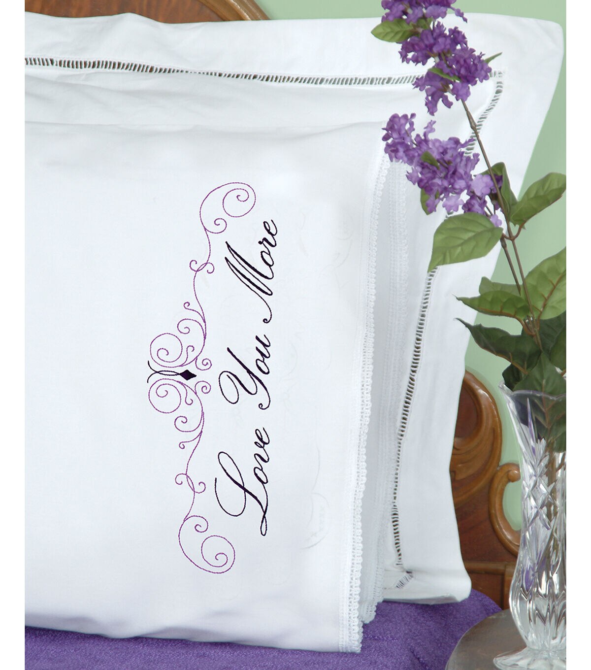Create beautiful pillowcases using the Jack Dempsey Needle Art Stamped Lace Edge Pillowcases-Love You More. The stitching designs have been stamped using ink that washes away with any liquid, and the fabric is a cotton/poly blend broadcloth. This package contains one pair of standard size pillowcases with finished edges, instructions for completion and care and a complete list of DMC floss requirements. Hoop, needle and floss are sold separately.
