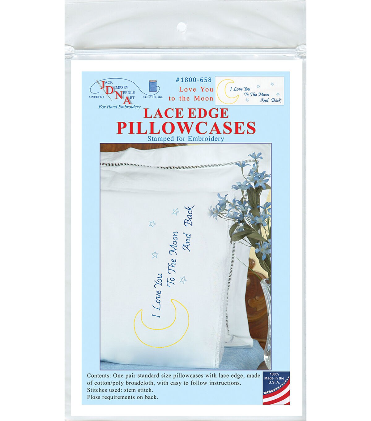 Create beautiful pillowcases using the Jack Dempsey Stamped Pillowcases with White Lace Edge-Love You Moon. The stitching designs have been stamped using ink that washes away with any liquid and the fabric is a cotton/poly blend broadcloth. This package contains one pair of standard size pillowcases with finished lace edges, instructions for completion and care, and a complete list of DMC floss requirements. Hoop, needle and floss sold separately.