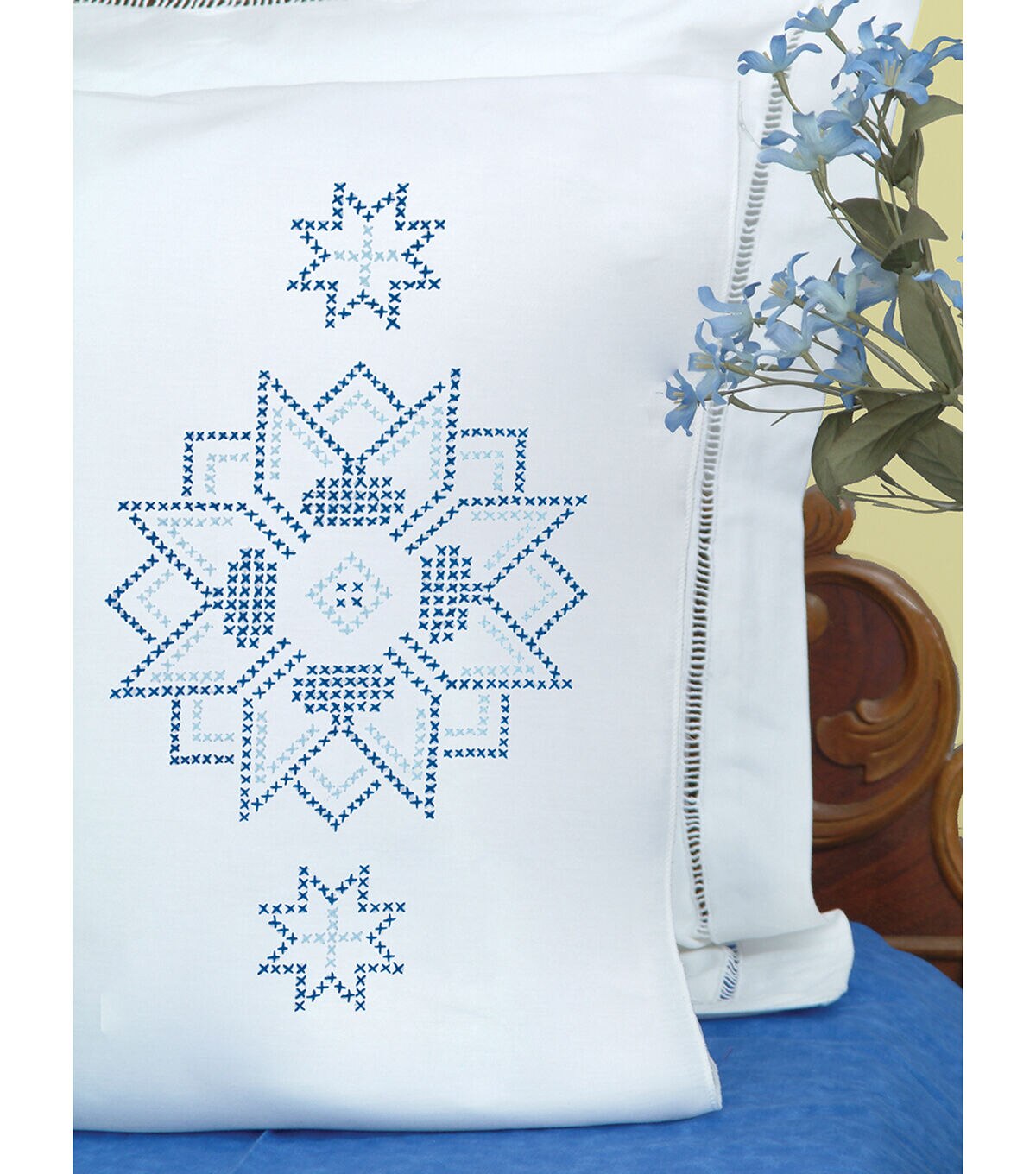 Create beautiful pillowcases using the Jack Dempsey Stamped Pillowcases with Perle Edges-XX Stars. The stitching designs have been stamped using ink that washes away with any liquid and the broadcloth fabric is a blend of cotton and polyester. This embroidery kit contains one pair of standard size pillowcases with finished lace edges, instructions for completion and care and a complete list of DMC floss requirements. Hoop, needle and floss are sold separately.