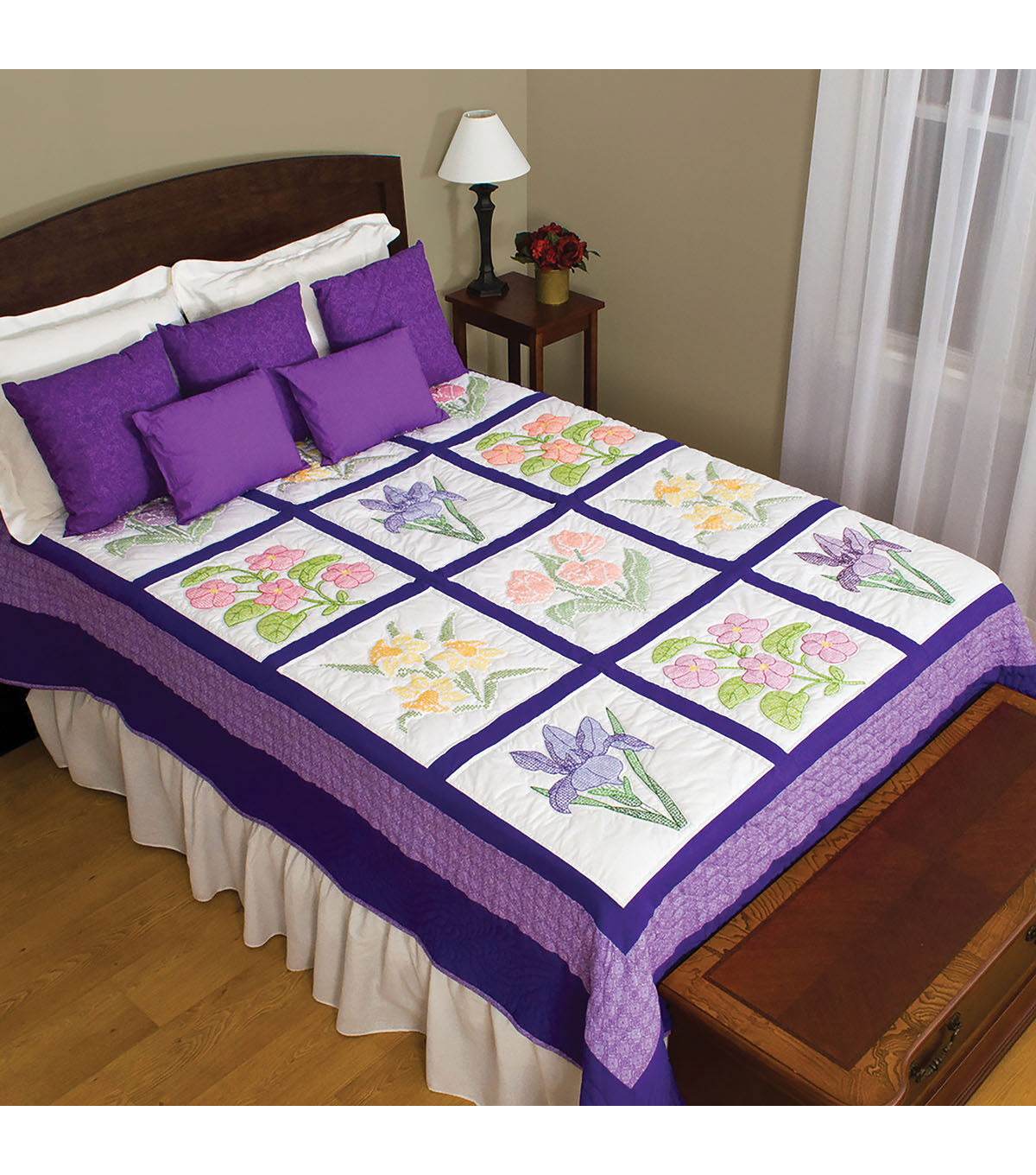 Create a beautiful quilt top using this great kit. It consists of individual squares to stitch and join together to form a quilt top. The stitching designs have been stamped using ink that washes away with any liquid and the fabric is a cotton/poly blend broadcloth. This package contains twelve 18x18 inch quilt squares, instructions for completion and care and complete list of DMC floss requirements. Fabric, backing, needle, thread and floss all sold separately. Design: Flowers. Made in USA.