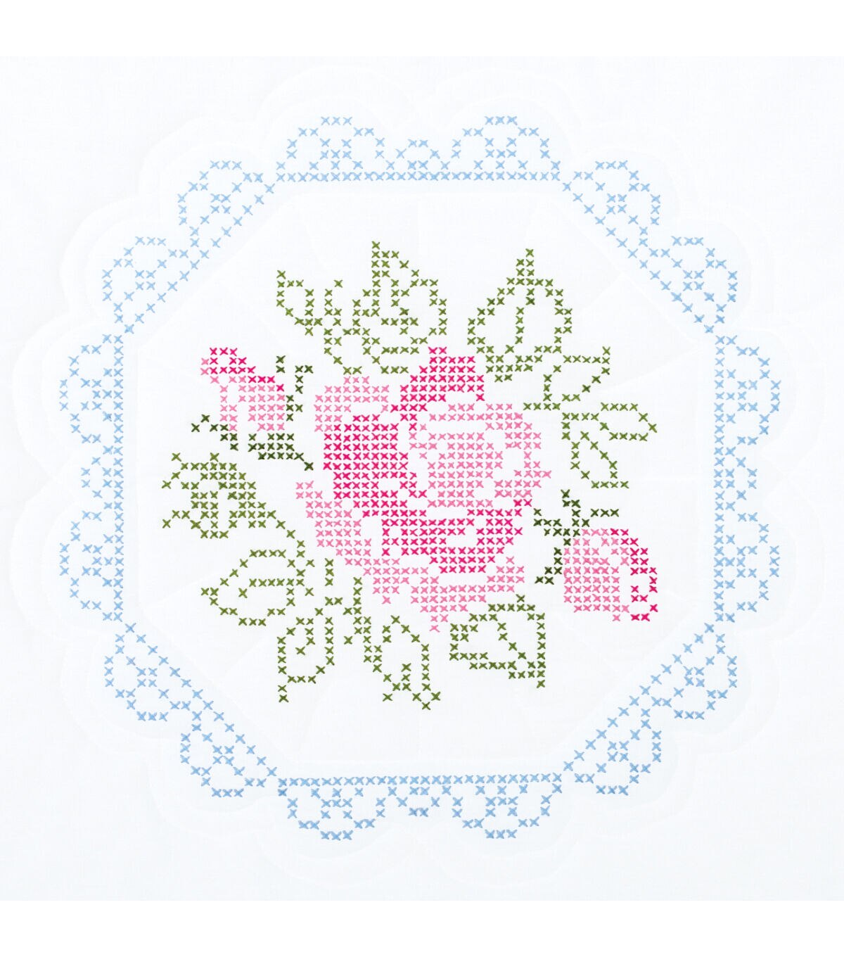 Create a delightful quilt top for your home with the Jack Dempsey Needle Art Stamped White Quilt Blocks 18'' x 18''. These stamped quilt blocks feature a lovely design in washable ink, so just put your hand embroidery skills to use and then stitch the completed blocks together. This package contains six quilt blocks made of cotton/poly broadcloth that measure 18 x 18 inches each, instructions and a list of floss requirements. Fabric backing, batting, hoop, needle and floss not included.