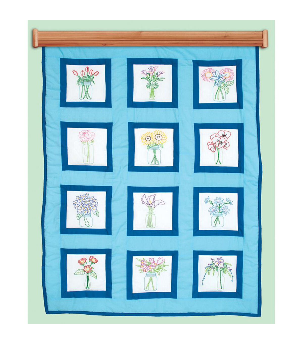 - Includes 12 quilt squares, instructions for completion and care and complete list of DMC floss requirements