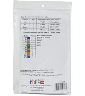 Create a beautiful quilt top using this great kit. It consists of individual squares to stitch and join together to form a quilt top. The stitching designs have been stamped using ink that washes away with any liquid and the fabric is a cotton/poly blend broadcloth. This package contains 12 9x9 inch quilt squares, instructions for completion and care and complete list of DMC floss requirements. Material for stripping, backing, batting, hoop, needle, thread and floss all sold separately. Design: Rainbow. Made in USA.