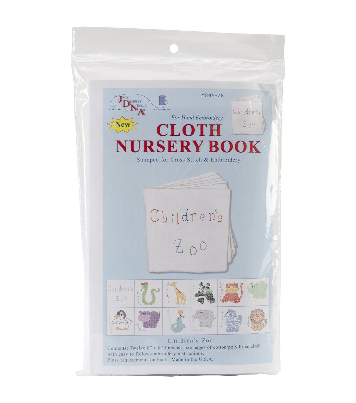 Weave adorable patterns for children with the Jack Dempsey 8 ''x 8'' Stamped Cloth Nursery Books Pack of 12. Each of these pages is made from cotton/poly blend broadcloth and features an intricate design which is completely washable. Use the included instructions to complete these prints with colorful stitches. It also comes with care instructions and a comprehensive list of DMC floss crochet-thread-and-floss requirements. This innovative stamped cloth nursery book is a great choice to combine fun and learning for kids.