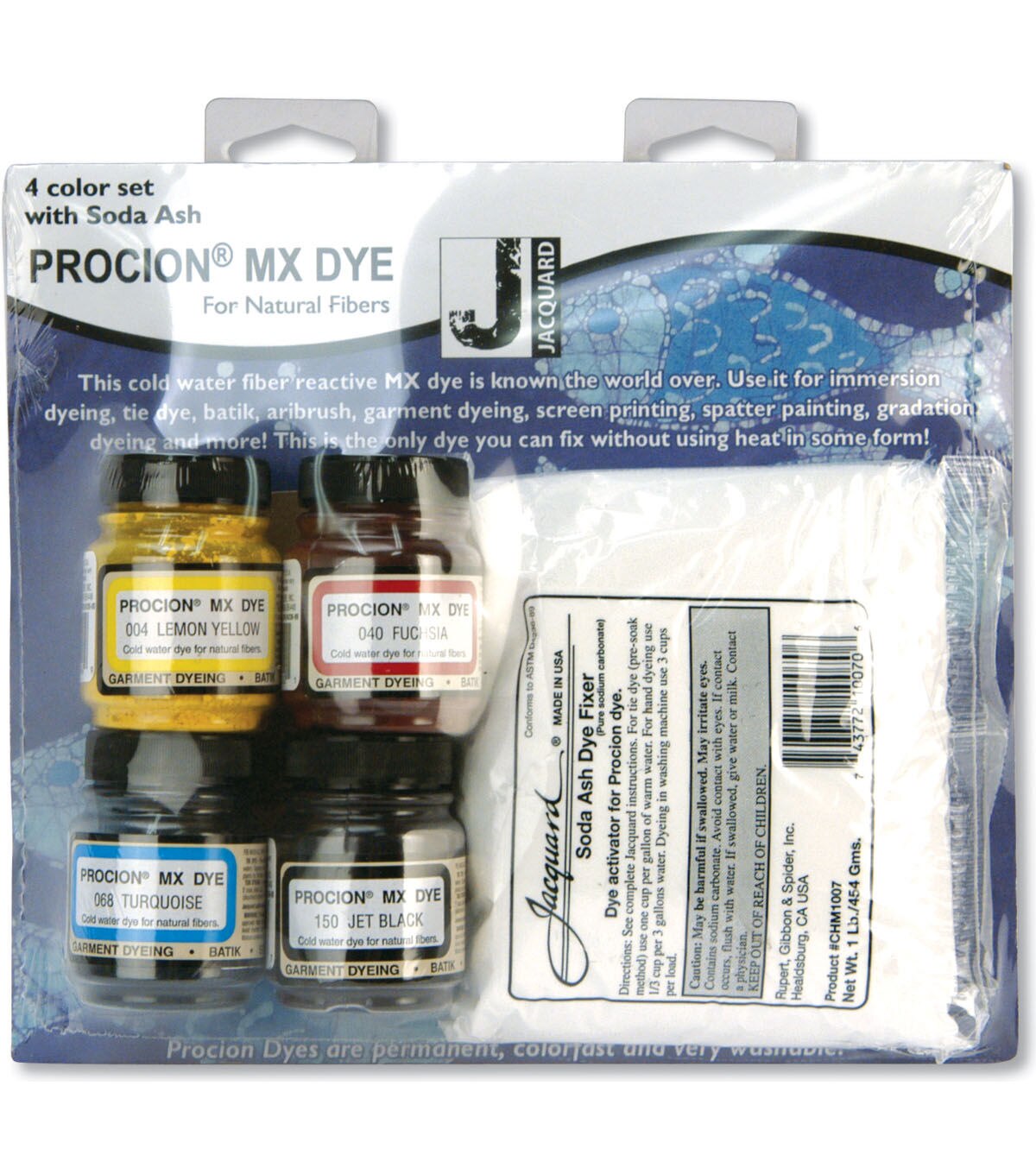 The Jacquard Procion MX Dye Set contains the most versatile and popular of dyes. They can be used for tie dye, batik, immersion dyeing and direct application. The dyes in this set are completely intermixable to achieve any color desired. This set contains 0.67 ounce each of lemon yellow, fuchsia, turquoise and jet black dyes, and 1 pound of soda ash fixer. Suitable for use in cold water on natural fibers.