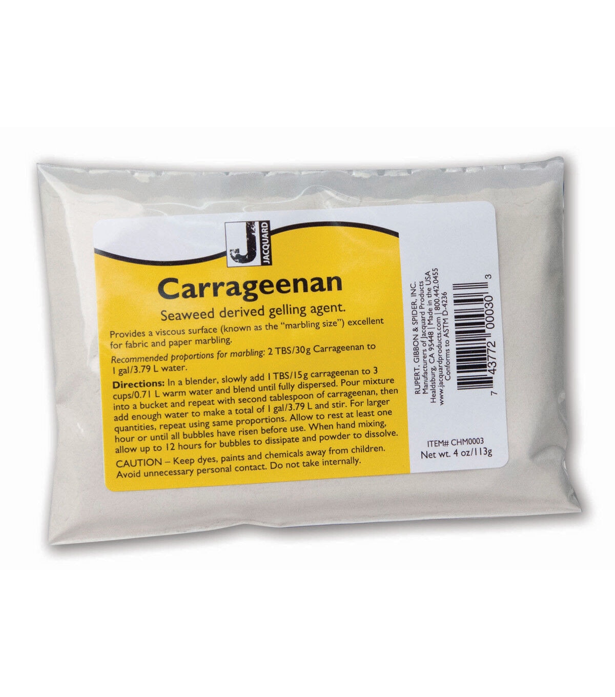 Carageenan is a gelling agent that provides viscosity for marbling on fabric. Slowly sprinkle one teaspoon of Calgon and two teaspoons of Carageenan into a quart of water in a running blender.