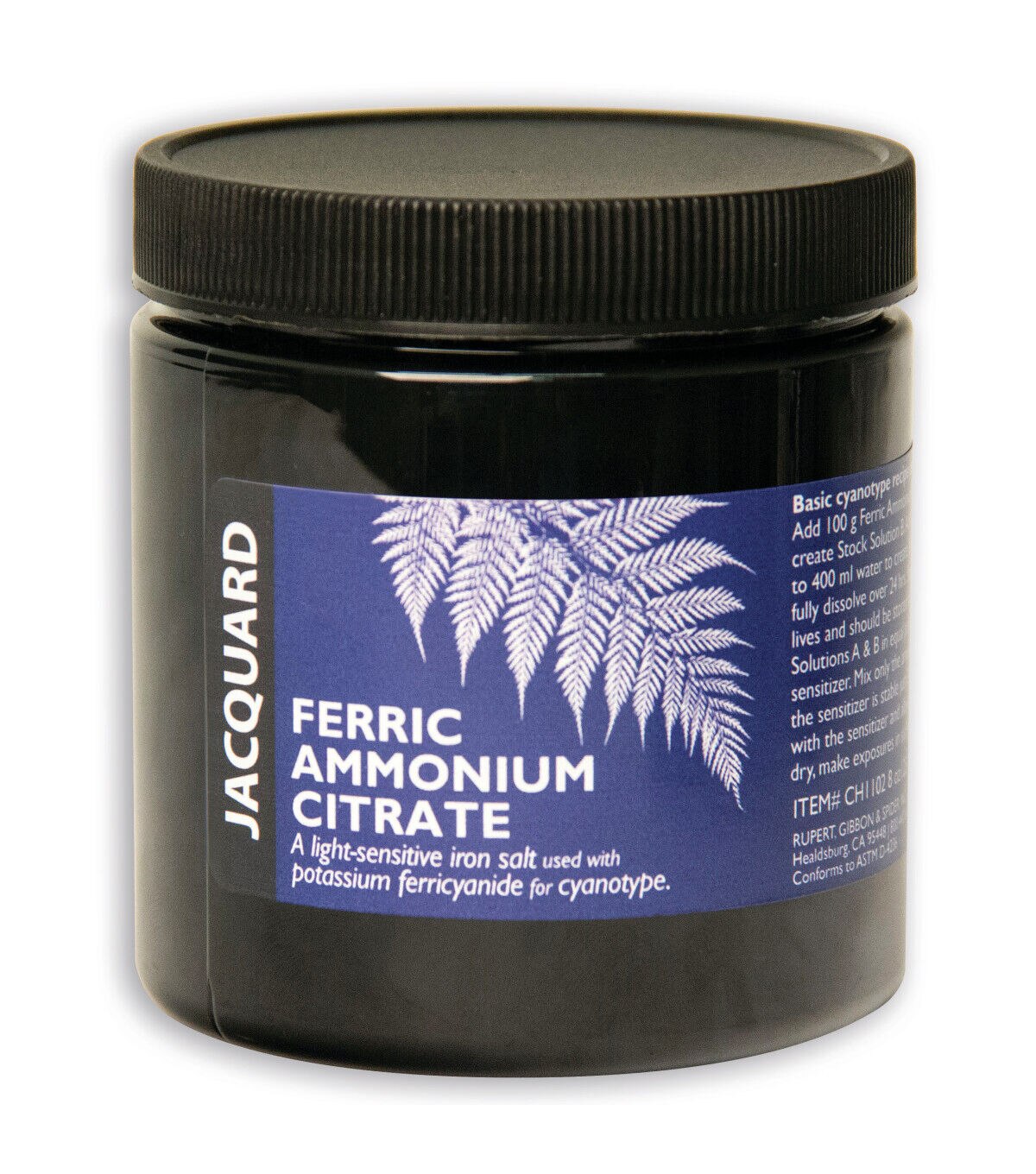 These chemicals are used for Cyanotype, a photographic printing process that produces a vibrant cyan-blue print. Potassium Ferricyanide is a light-sensitive iron salt; when you add it to any natural surface, including cotton, linen, silk, canvas, wool, paper, wood and leather, it enables you to create a dynamic composition.