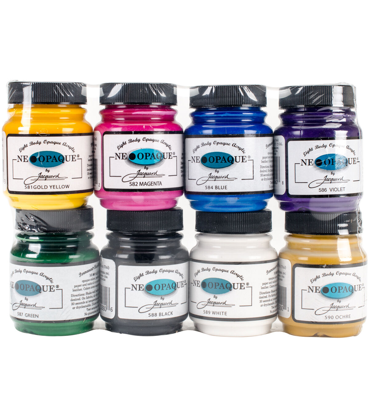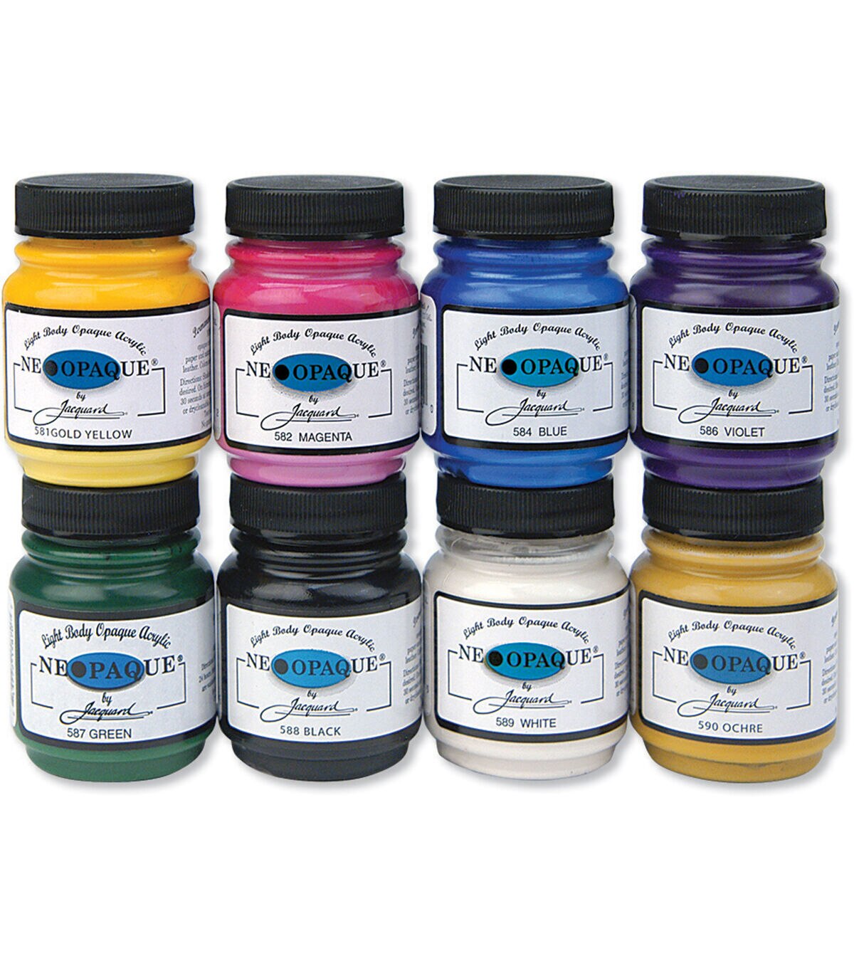 Jacquard Products-Neopaque Acrylic Paint. These paints are light body, opaque acrylics that can be painted, screened, stenciled, marbled and stamped. Use them on all surfaces including wood, canvas, paper and fabric. This package contains eight 2.25oz bottles of paint in assorted colors. Conforms to ASDM D4236. Made in USA.