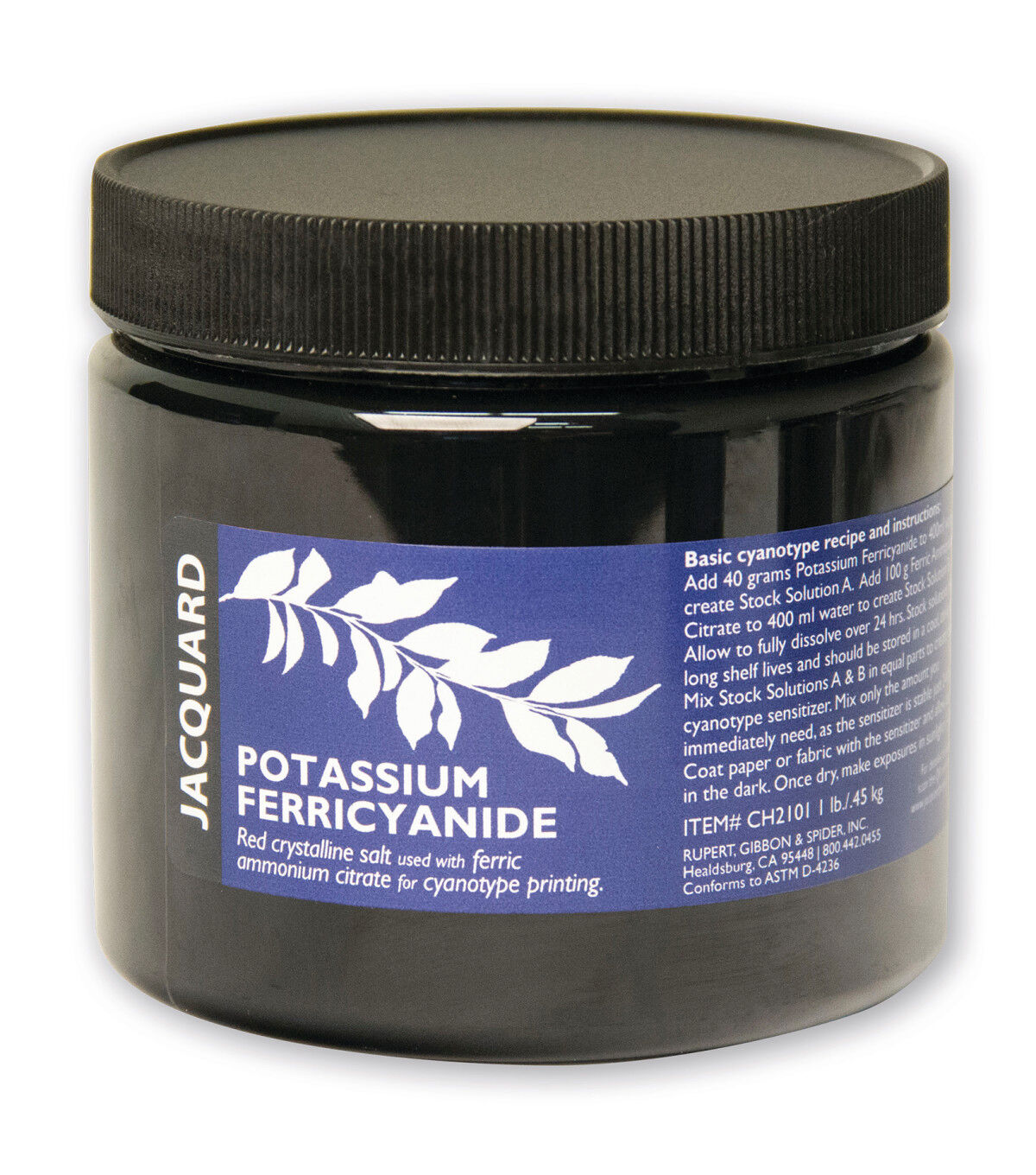 These chemicals are used for Cyanotype, a photographic printing process that produces a vibrant cyan-blue print. Potassium Ferricyanide is a light-sensitive iron salt; when you add it to any natural surface, including cotton, linen, silk, canvas, wool, paper, wood and leather, it enables you to create a dynamic composition.