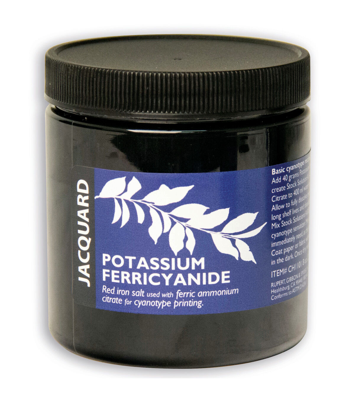 These chemicals are used for Cyanotype, a photographic printing process that produces a vibrant cyan-blue print. Potassium Ferricyanide is a light-sensitive iron salt; when you add it to any natural surface, including cotton, linen, silk, canvas, wool, paper, wood and leather, it enables you to create a dynamic composition.