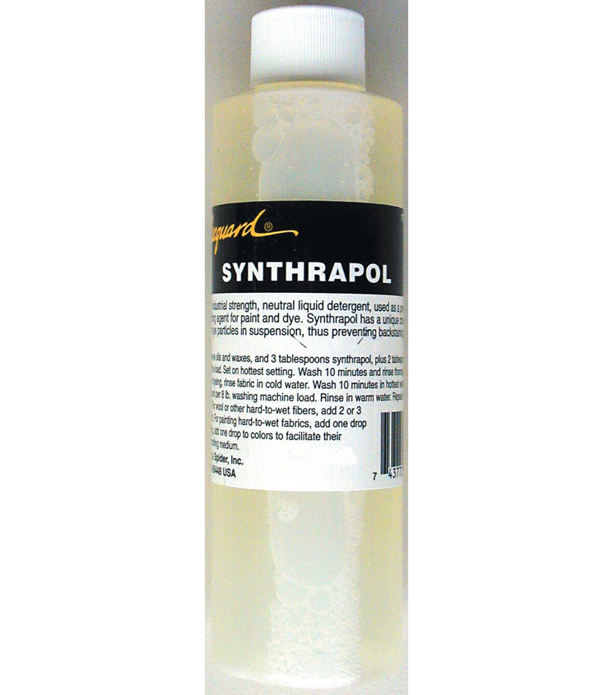 Synthrapol is a liquid detergent used as a prewash and afterwash for dyed or painted fabrics and as a wetting agent for fabric dyes and paints. Synthrapol has the unique property of keeping loose dye suspended during washing, thus preventing backstaining while aiding in the removal of excess color.