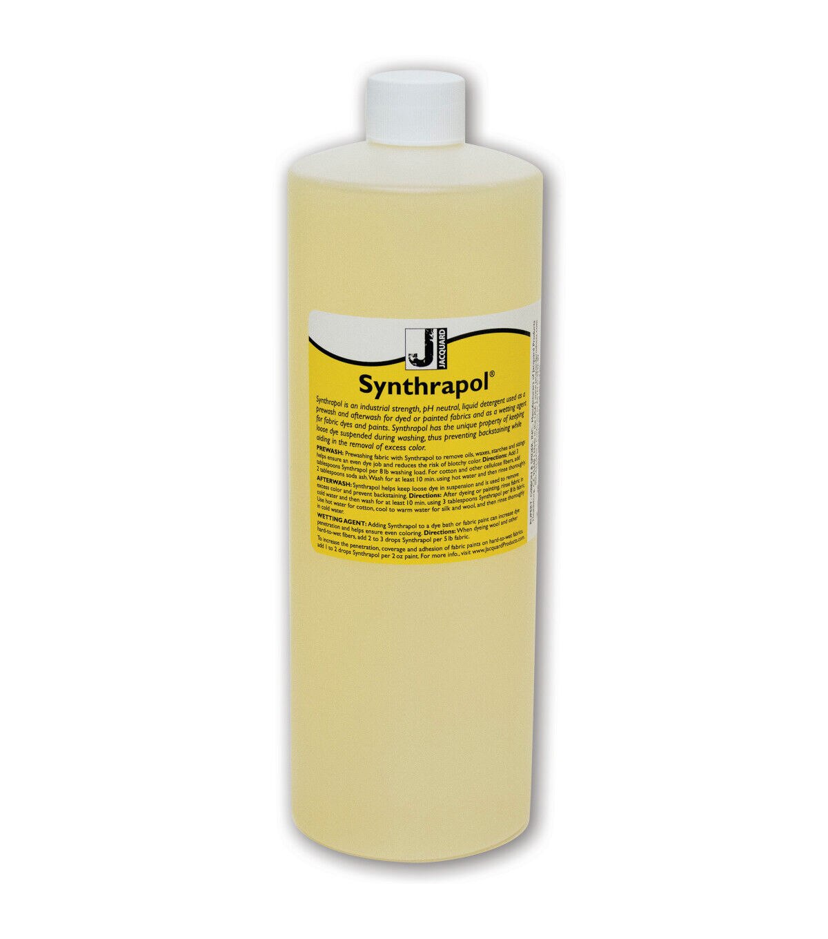 Synthrapol is a liquid detergent used as a prewash and afterwash for dyed or painted fabrics and as a wetting agent for fabric dyes and paints. Synthrapol has the unique property of keeping loose dye suspended during washing, thus preventing backstaining while aiding in the removal of excess color.