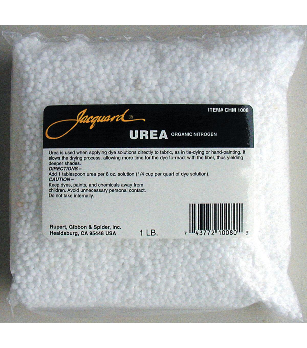 Urea is used when applying dye solutions directly to fabric, as in tie dyeing or hand painting. It attracts moisture from the air to keep the fabric damp for a longer stretch of time - allowing for more time for the dye to react with the fiber and yields deeper shades. Urea can be used with Sodium Alginate thickener for screen printing, painting or direct dye application. Urea helps to lengthen the reaction time in dyeing for more brilliant colors.