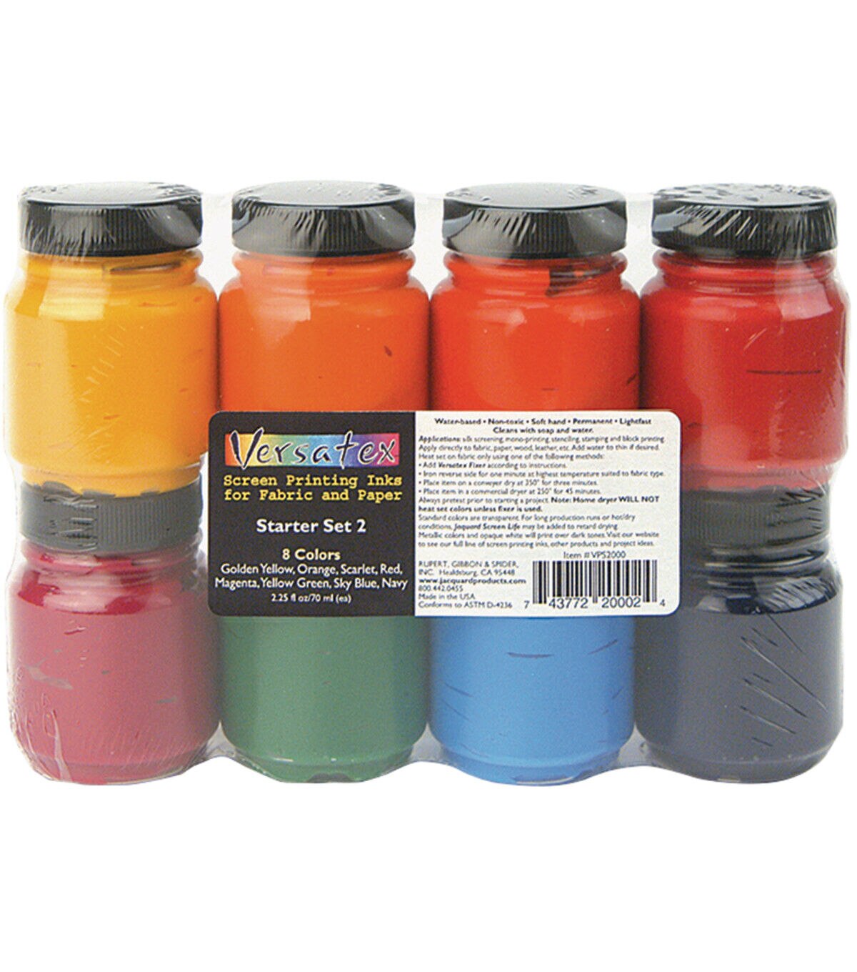 Get started in silkscreen printing, or use the paints in this kit directly on fabrics. This printing ink is heavily pigmented, with a thick and creamy consistency ideal for creating on textiles, as dyes for batiks, silk-screening, stenciling or block printing. This intermixable, somewhat transparent ink will maintain the texture and softness of your fabric. It works best on light fabric, and the color is deepest when applied at packaged strength and become permanent when heat set properly. This set contains eight 2 oz. colors: Gold Yellow, Red, Sky Blue, Orange, Magenta, Navy, Scarlet and Yellow Green; easy-to-follow instructions are also included.