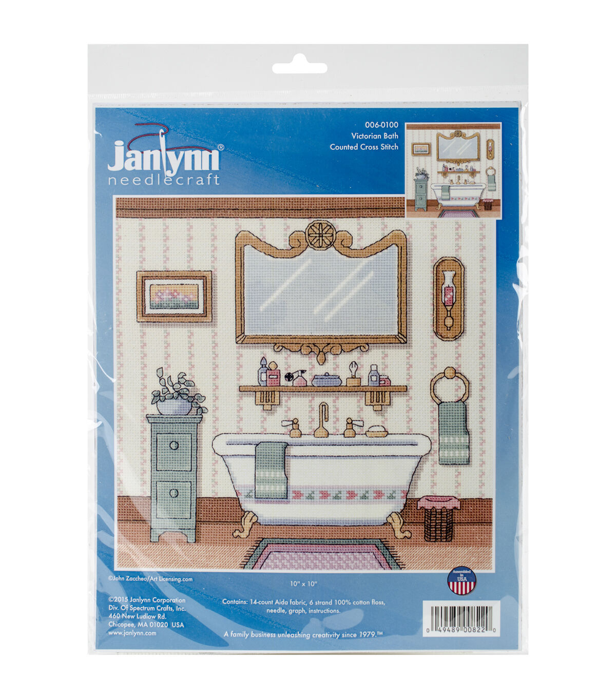 Whip up a beautiful design in a jiffy with the Janlynn® 10" x 10" Counted Cross Stitch Kit-Victorian Bath. This counted cross stitch kit includes all the supplies you need to complete the project, including 14-count Aida fabric, six-strand 100% cotton floss, a needle, a graph and detailed instructions. With a nostalgic design exhibiting a clawfoot tub, mirror and accessories, the project will make a great home decor accent. The finished design measures 10 x 10 inches.