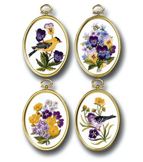 Wildflowers and Finches are beautifully detailed in these four Crewel embroidery kits. Each embroidery kit contains screen-printed white 50% cotton/ 50% polyester fabric, 6-strand cotton floss, four gold key oval frames, needle, graph and instructions.