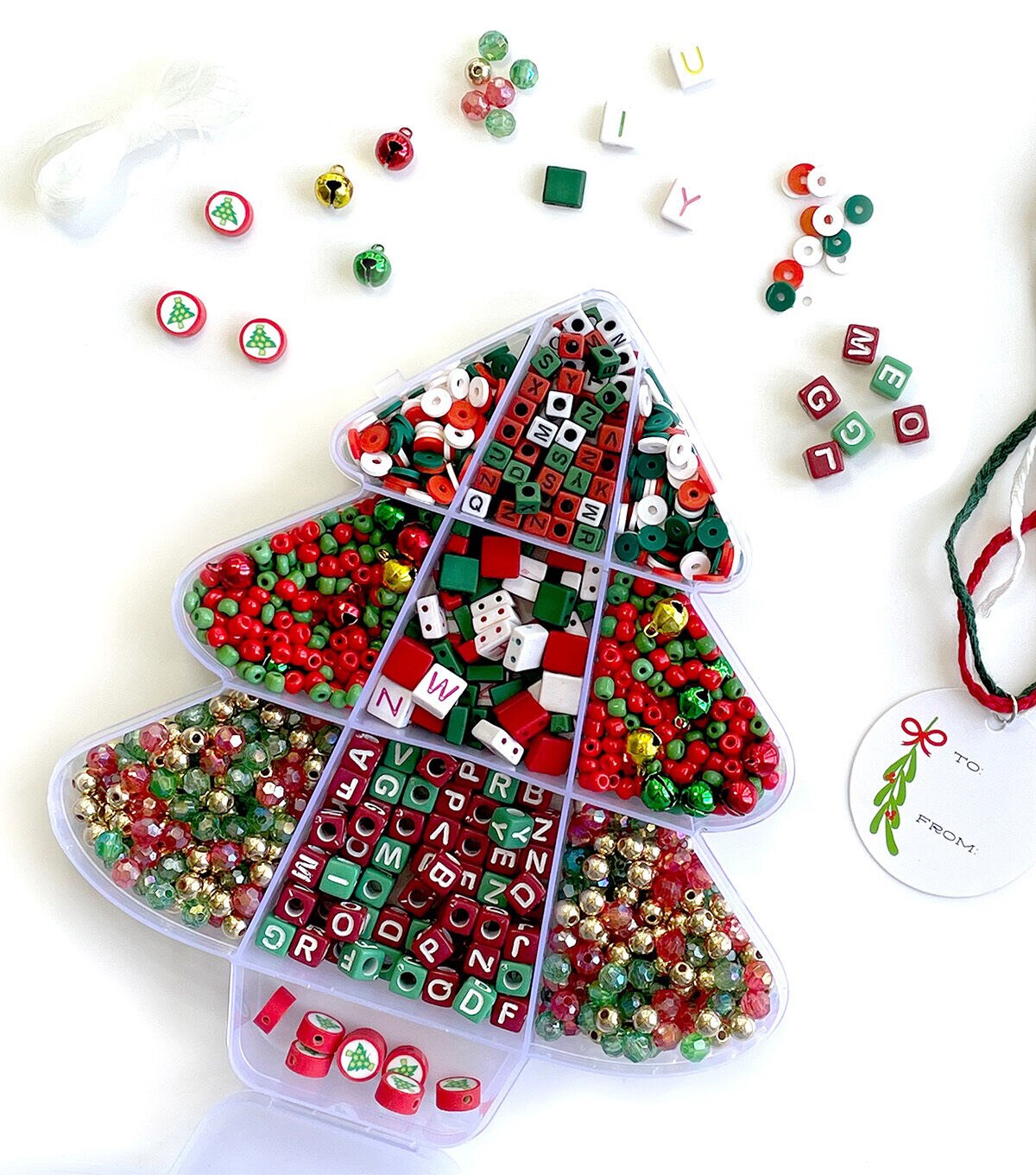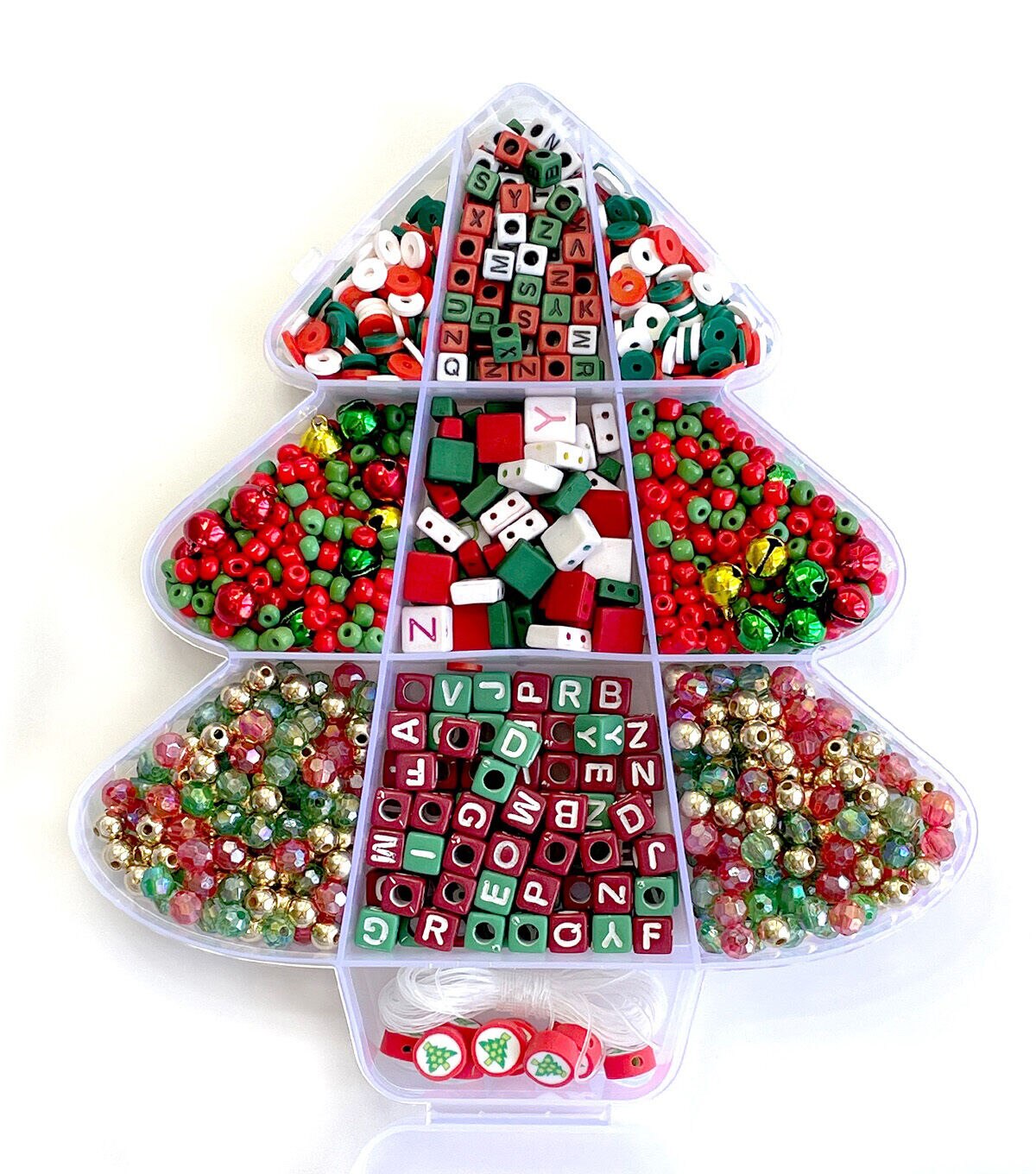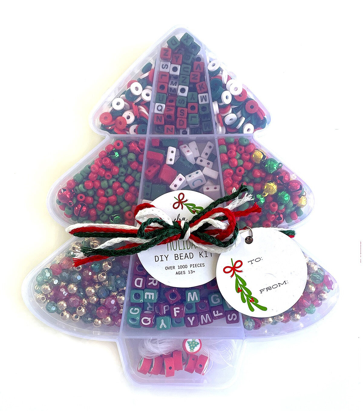 The creations can be endless using this great bead kit. The container is in the shape of a Christmas Tree. The kit includes 8 different styles of beads including alphabet beads. There are red and green see beads, red white and green heishi beads, three different styles of alphabet beads, round FIMO beads and more! Stretch cord is included. 1000+ pieces