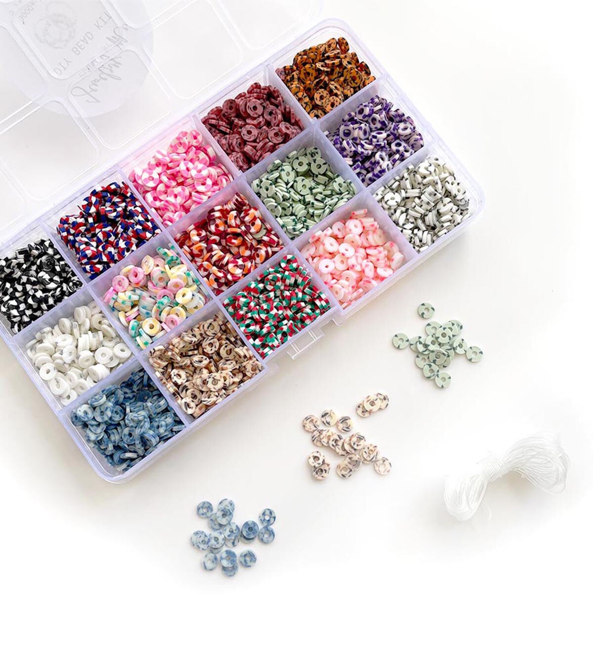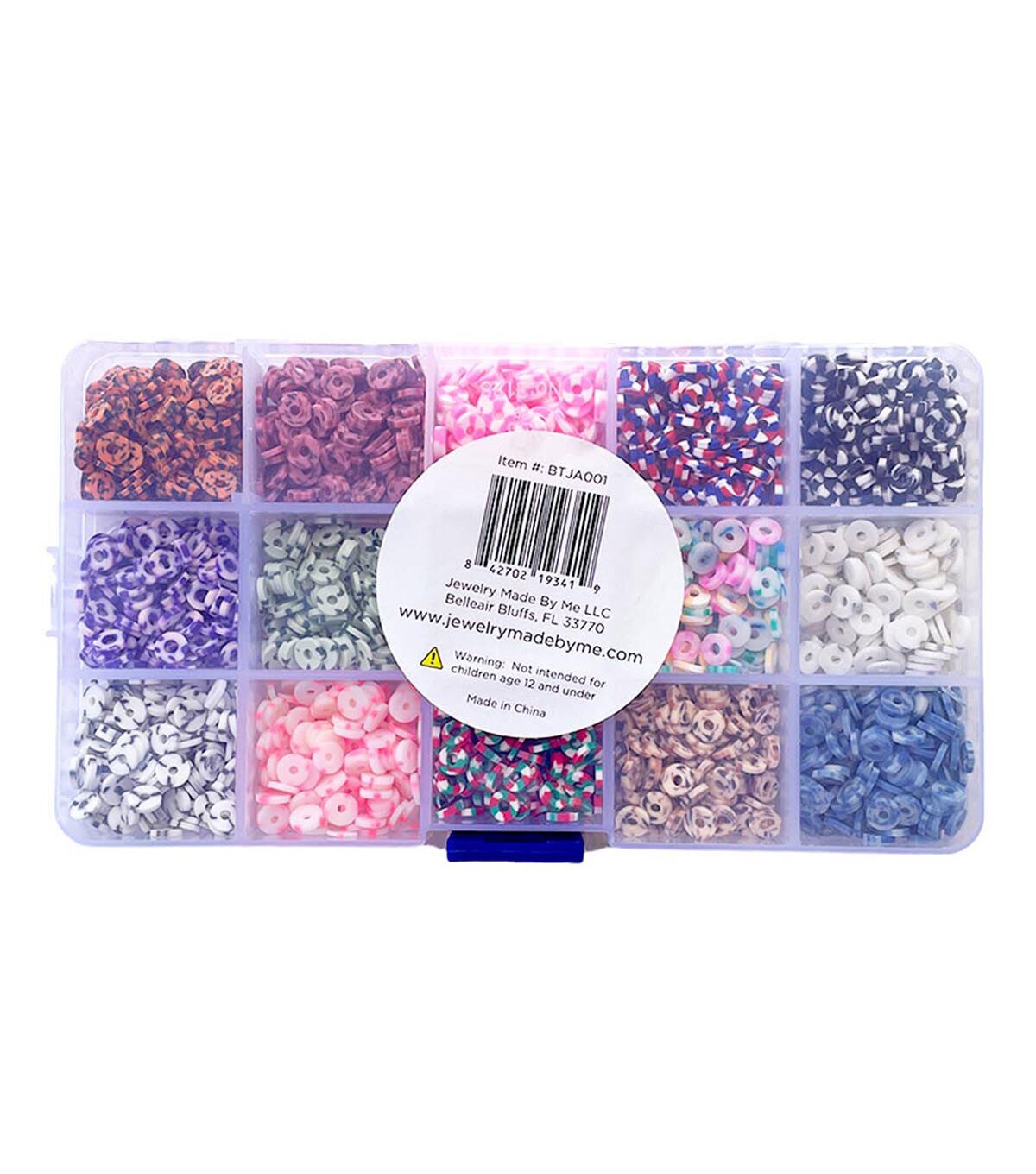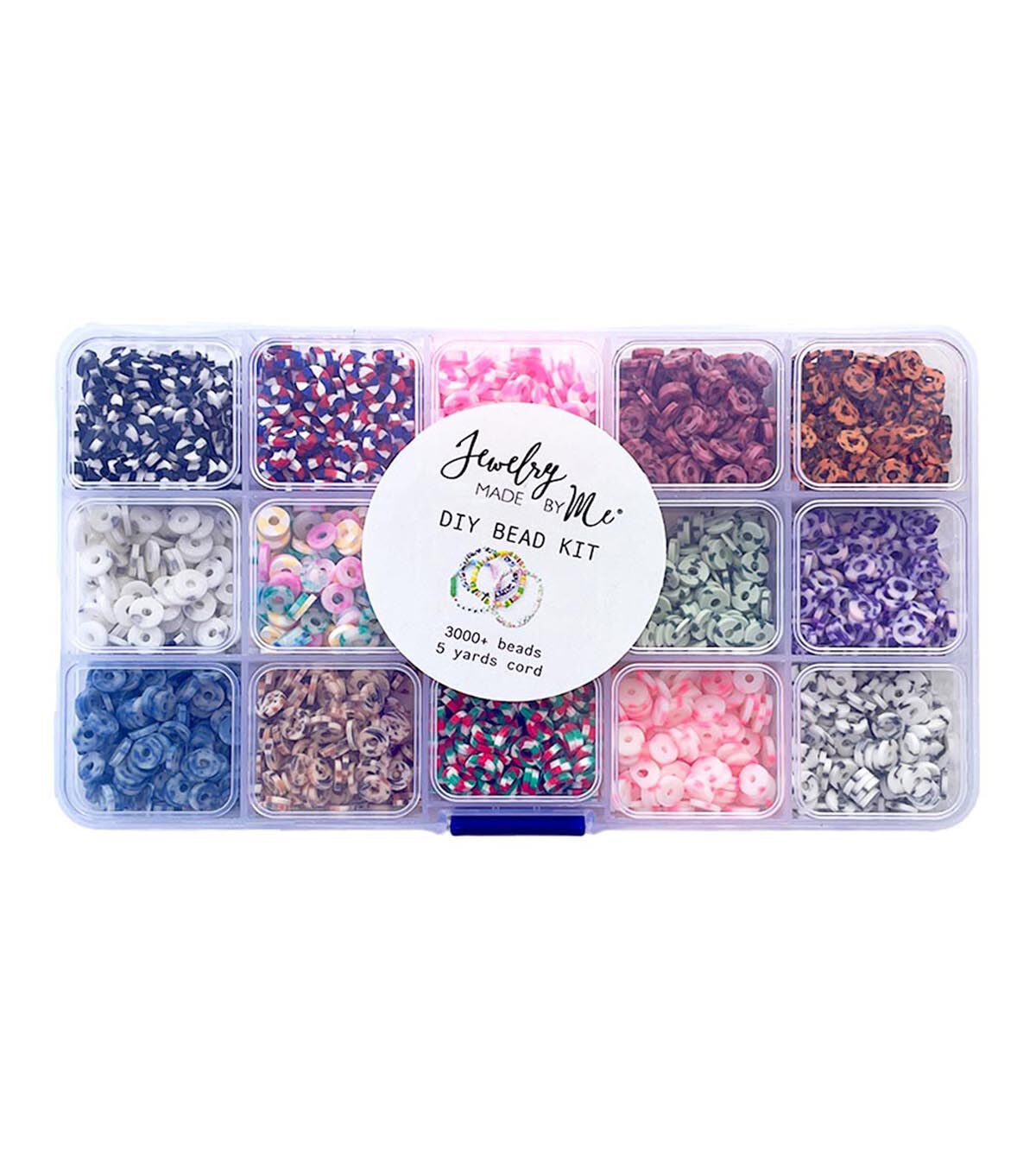 The Jewelry Made by Me Mega Alphabets & Heishi Box DIY Bead Kit contains over 3000 speckled and striped colorful polymer clay Heishi beads and 5 yards of stretch cord in a convenient storage box. String these beads onto the included stretch cord to make up to 20 easy-to-wear bracelets! Make custom bracelets and personalized gifts with this bracelet making kit!