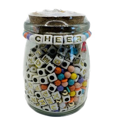 Create your own this holiday season with this great DIY bead jar. In bold pastel colors, this jar has a variety of smooth round beads, round gold beads and white alphabet beads with gold letters. There is a gnome charm in pastel colors. Stretch cord is included. 800+ pieces