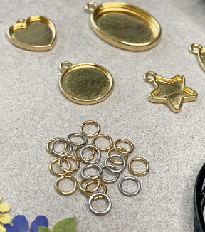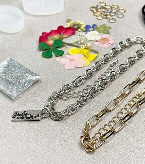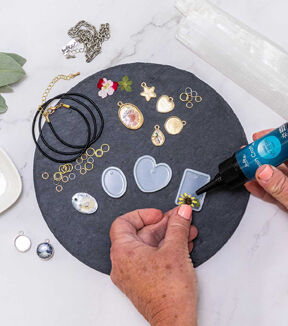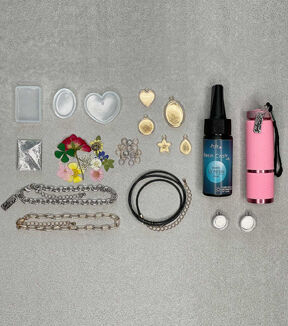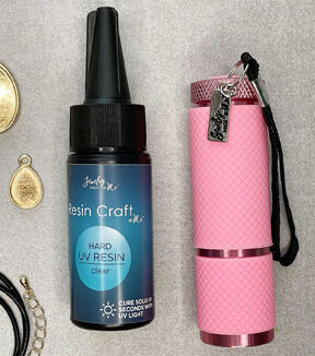 Simply pour, customize and cure! The Resin Craft by MeDelux Resin Kit in a Pouch is the fast and easy start to making custom UV resin jewelry in minutes. The kit makes 1 necklace and 2 bracelets, and includes reusable silicone molds. Included: 1 bottle 25ml clear UV resin 1 6W UV light (batteries not included, requires 3AAA batteries) 3 silicone molds 7 fillable bezel charms 10 dried flowers glitter 20 jump rings 1 16" leather necklace with extender 2 7" adjusable length chain bracelets