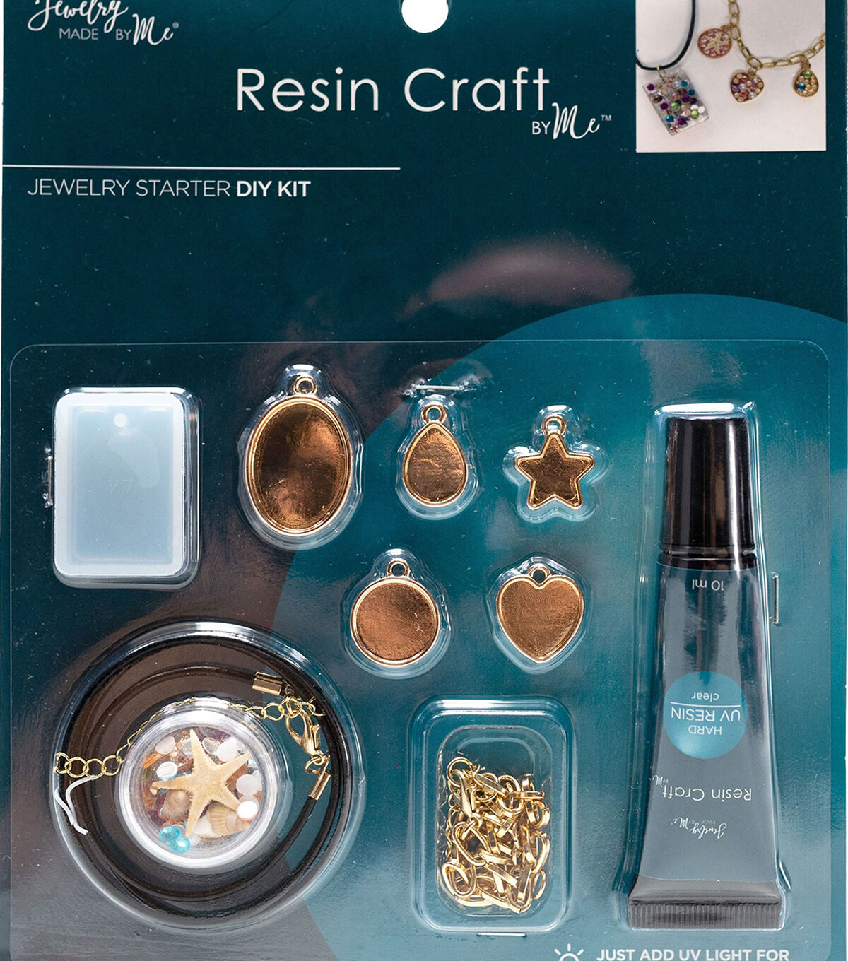 Simply pour, customize and cure! The Starter Kit is the fast and easy start to making custom UV resin jewelry in minutes. UV light not included. This 6.5x.7x8 inch package contains one bottle of 10ml clear UV resin, one silicone mold, 16-inch leather necklace with extender, 7-inch adjustable length chain bracelet, one jar mixed inclusions, five refillable bezel charms. CAUTION: When handling, cured resin might be HOT! CAUTION: Keep out of reach of children. Use resin in a well ventilated area. Avoid contact with skin. May be harmful in swallowed. May cause eye irritation. Not edible. Store in a cool, dry place. Conforms to ASTM D4236. WARNING: Not intended for children age 12 and under. Imported.