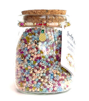 Create and personalize your own customized stretch bracelets with these bright colored beads and alphabets. 100 grams of beads and 5 yards of stretch cord in a glass jar with cork lid.